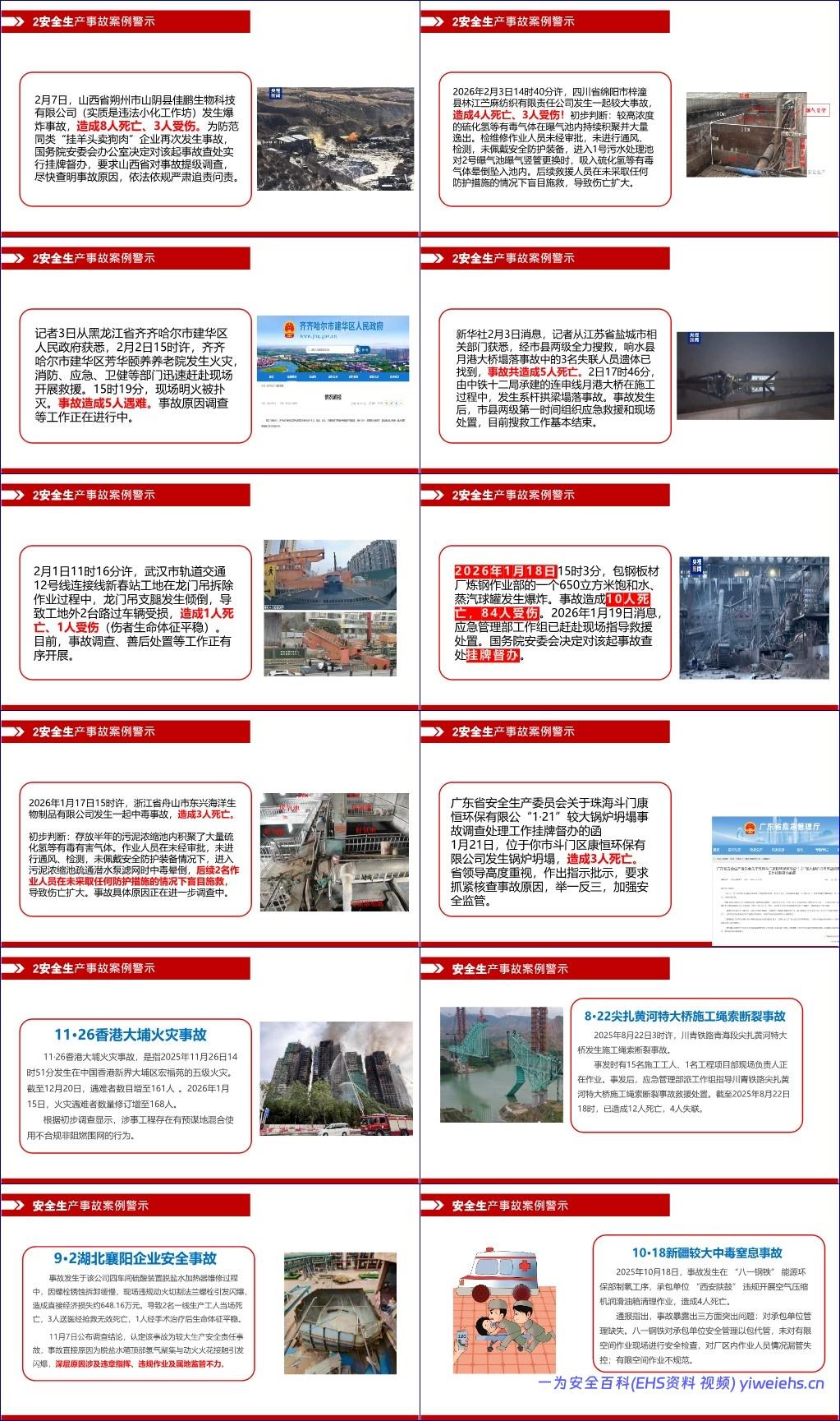 文档列举了多起发生在2024年至2026年初的严重安全生产事故,用以警示员工: