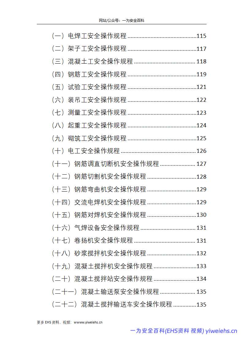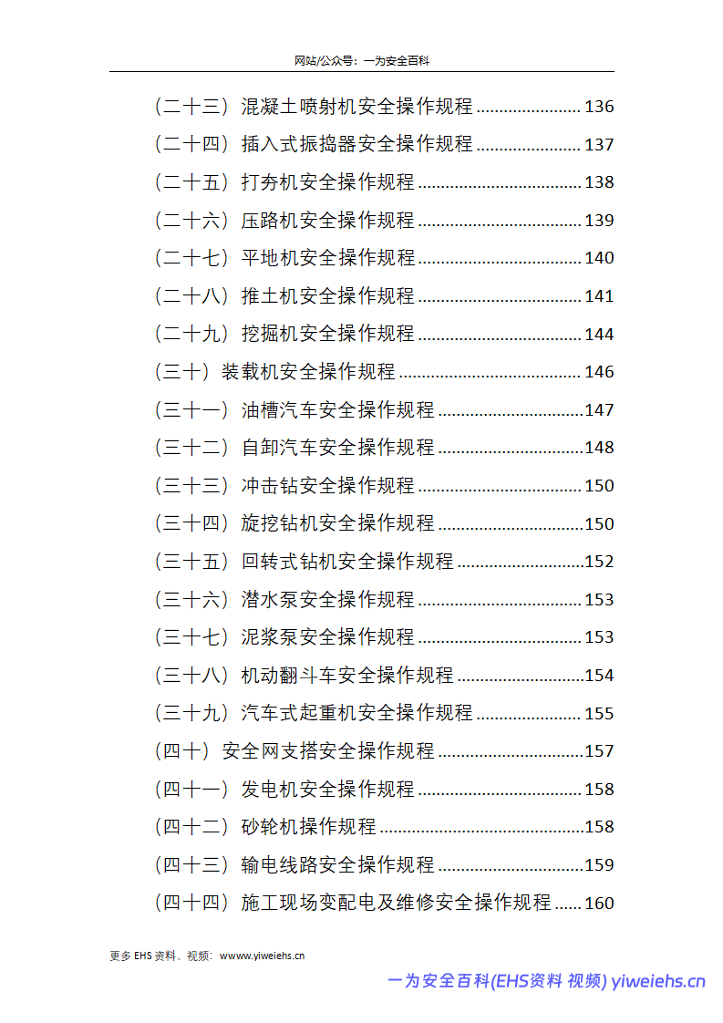 提供了详尽的工种和机械操作安全规程,涵盖电焊工、架子工、混凝土工、钢筋工等常见工种,以及搅拌机、起重机、挖掘机、装载机、钻机等各类施工机械的操作规范,强调持证上岗、劳保佩戴及设备检查。