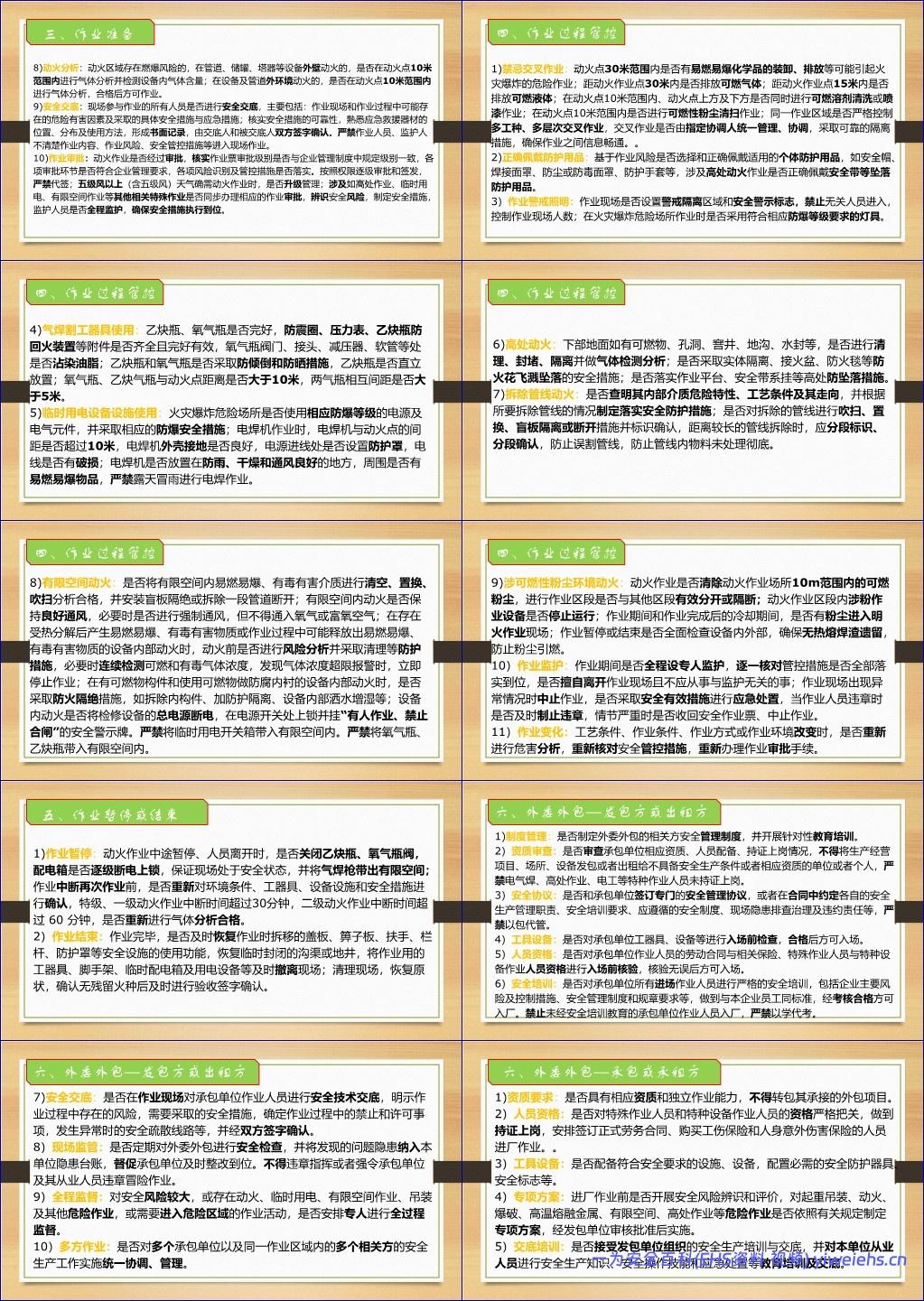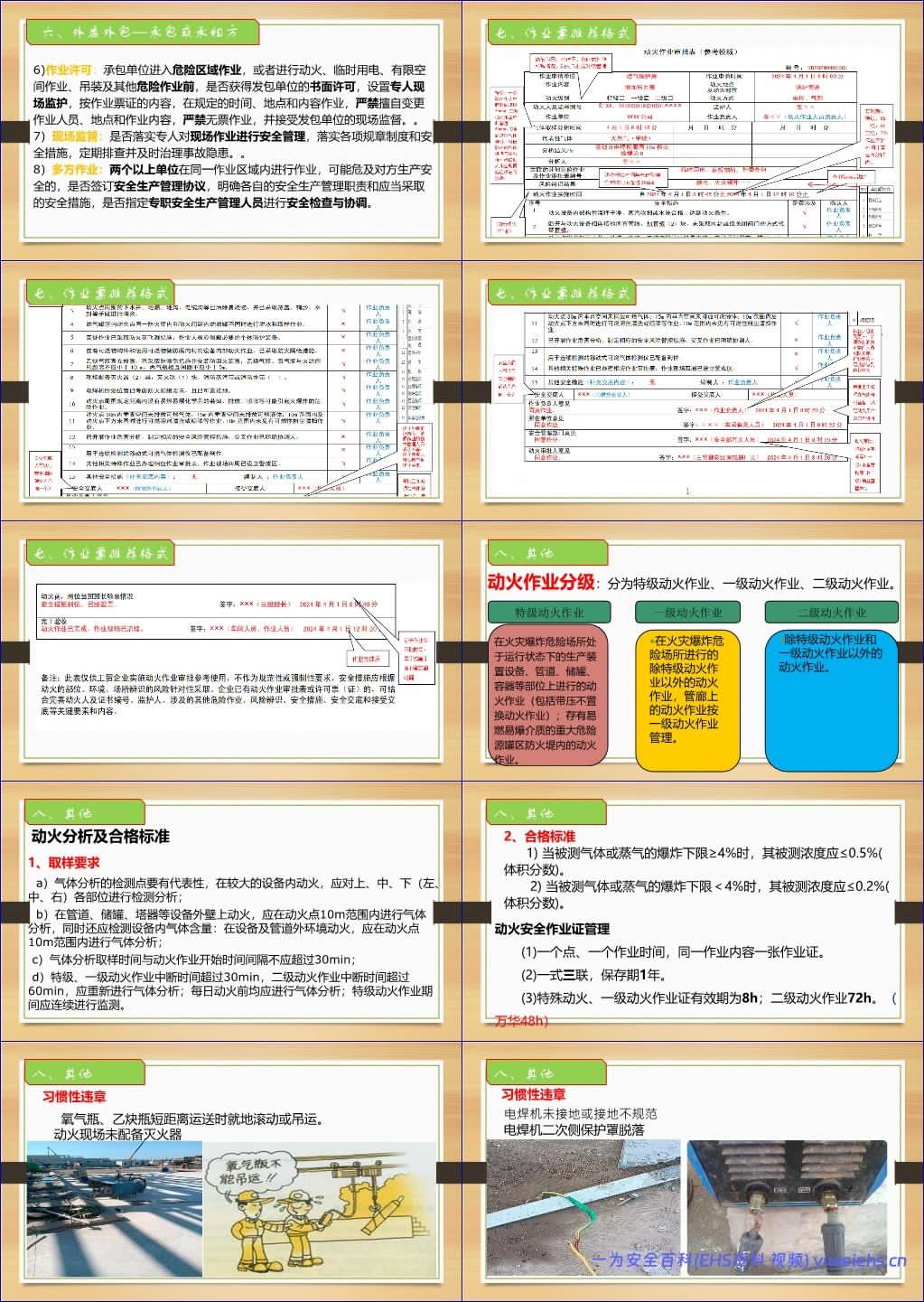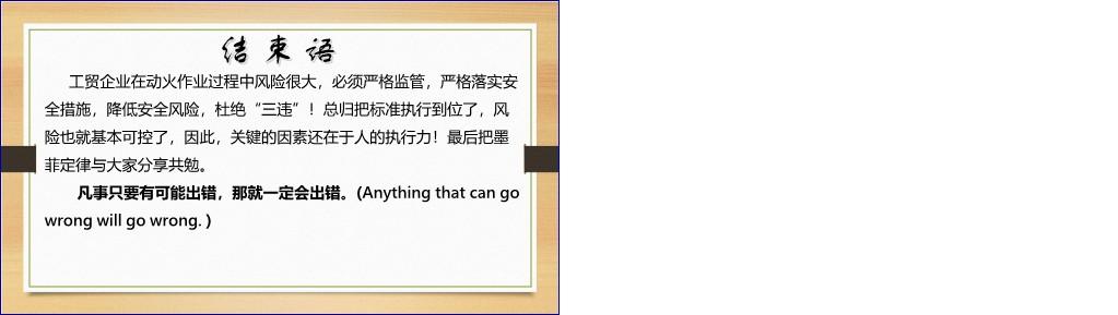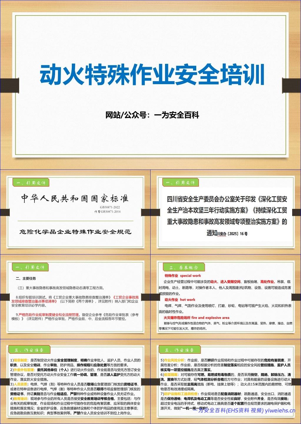 该文档《动火特殊作业安全培训课件》系统阐述了危险化学品及工贸企业中动火作业的安全管理要求,依据国家标准《GB30871-2022 危险化学品企业特殊作业安全规范》,全面覆盖作业前准备、作业过程管控、暂停与结束、外委外包管理等关键环节。内容强调:必须建立健全安全管理制度,严格作业审批流程,落实风险辨识与能量隔离措施;特种作业人员须持证上岗,并接受充分的安全教育培训;作业现场需配备合格消防器材、规范使用气焊割工具(如氧气瓶、乙炔瓶间距≥5米,距动火点≥10米),严禁交叉作业;在有限空间、高处、可燃粉尘环境等特殊场景下动火,须采取针对性防护与连续气体监测;外委作业时,发包方与承包方均须履行安全管理职责,签订协议、统一协调、全程监督。文档特别指出,习惯性违章(如电焊机未接地、气瓶滚动搬运、现场无灭火器)是重大隐患源头,必须杜绝“三违”行为。最终强调:标准执行的关键在于人的执行力,并以墨菲定律警示——“凡事可能出错,就一定会出错”。