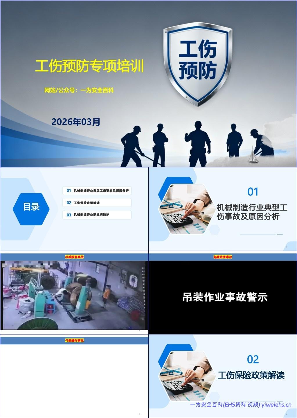 该《工伤预防专项培训》PPT文档系统阐述了机械制造行业在安全生产与职业健康方面的核心内容,围绕“工伤预防”这一主线,从典型事故分析、政策法规解读到职业病防护措施进行了全面讲解。
