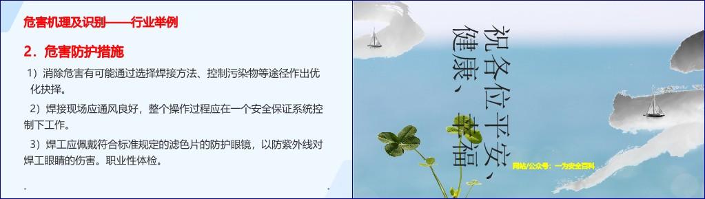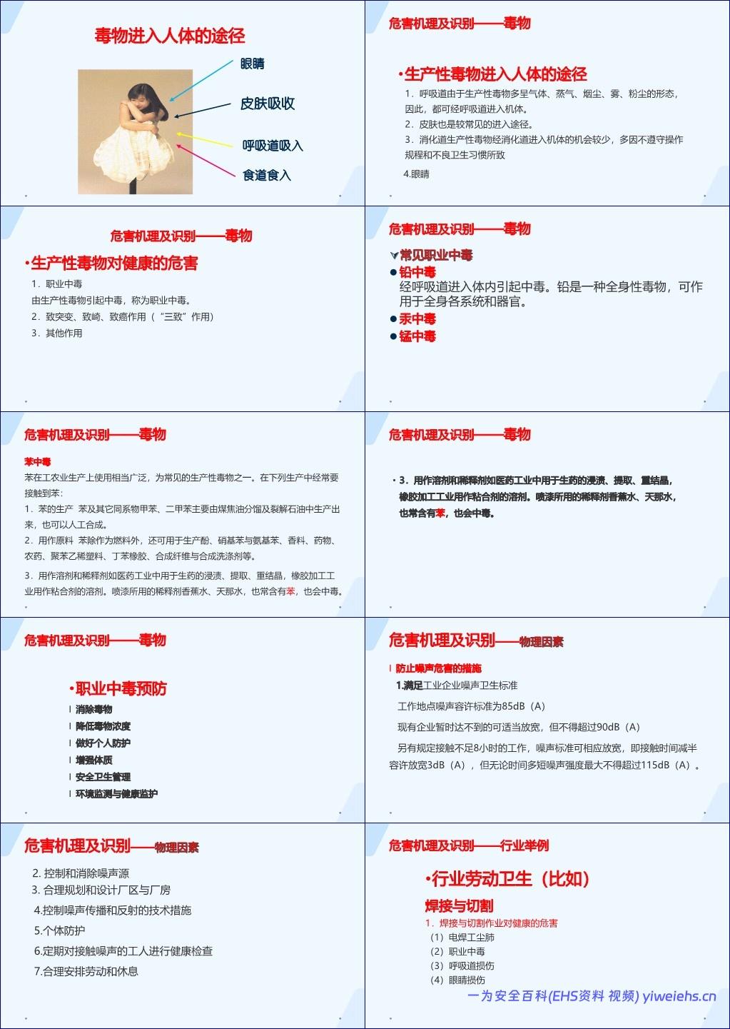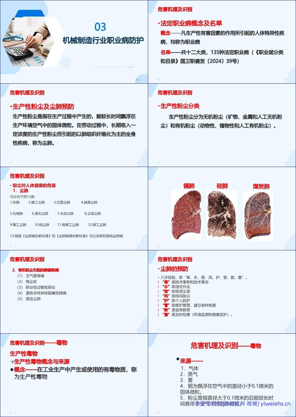 在职业病防护部分,重点介绍了尘肺病(如电焊工尘肺、铸工尘肺等13类)、职业中毒(如铅、汞、苯中毒)及噪声危害等主要职业健康风险,并提出“革、水、密、风、护、管、教、查”八字防尘方针,以及通风、个体防护、健康监护等综合防控手段。特别强调焊接与切割作业中的多重危害及针对性防护措施。