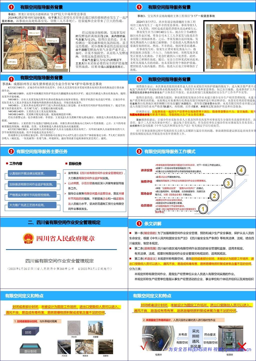 该培训课件旨在提升企业及监管人员对有限空间作业安全的认知与管理能力,以遏制频发的较大事故。文档首先通过多起真实、惨痛的事故案例(如成都彭州“4·13”七人死亡事故)揭示了当前严峻的安全形势,指出事故主因在于企业“不懂不会”、现场缺乏有效监护、以及事故发生后普遍存在的盲目施救行为。