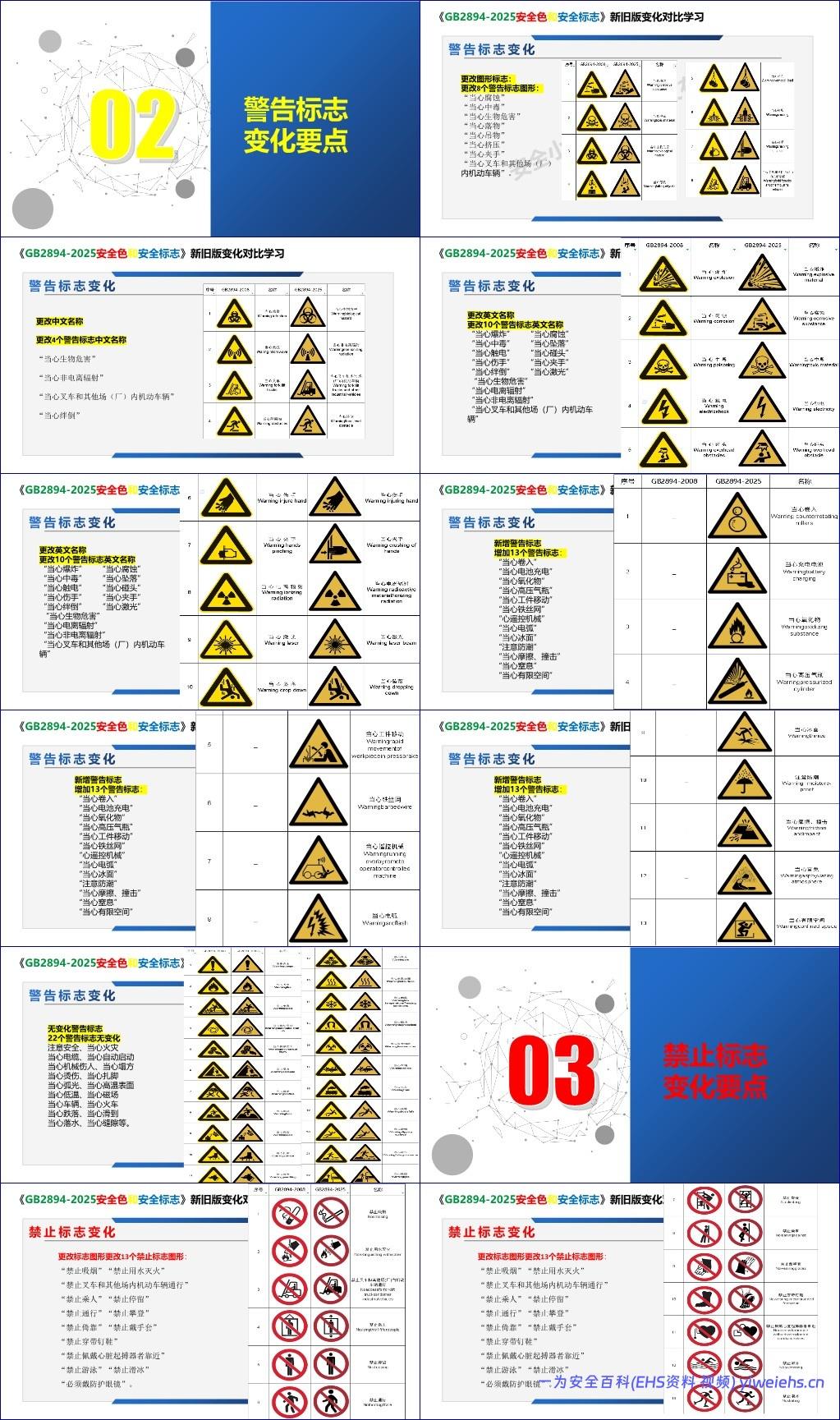 标志基本型式更新:四类安全标志(警告、禁止、指令、提示)中,警告标志的图形变化最为显著,而其他三类主要在颜色细节上优化。