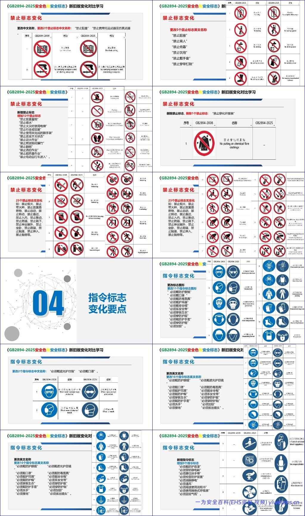 禁止标志:新增12个(如“禁止酒后作业”“禁止动火作业”),修改13个图形、2个中文名、5个英文名,删除1个,23个无变化。