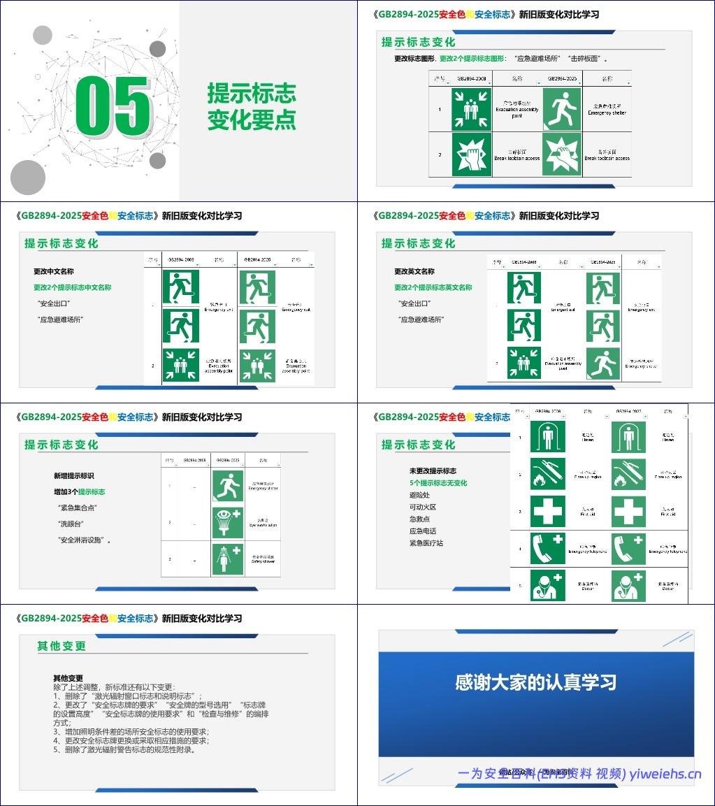 提示标志:新增3个(“紧急集合点”“洗眼台”“安全淋浴设施”),修改2个图形及其中英文名称,5个保持不变。