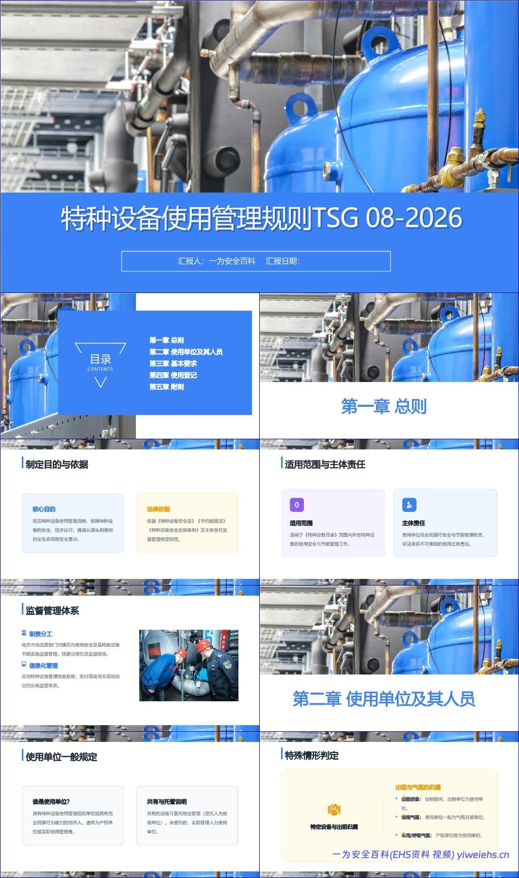 《特种设备使用管理规则(TSG 08-2026)解读》文档全面系统地阐述了自2026年5月1日起施行的新版特种设备使用管理规范,取代了旧版TSG 08-2017。该规则以《特种设备安全法》《节约能源法》等法律法规为依据,旨在规范特种设备从采购、安装、使用到报废的全生命周期管理,强化使用单位主体责任,保障设备安全与节能运行。