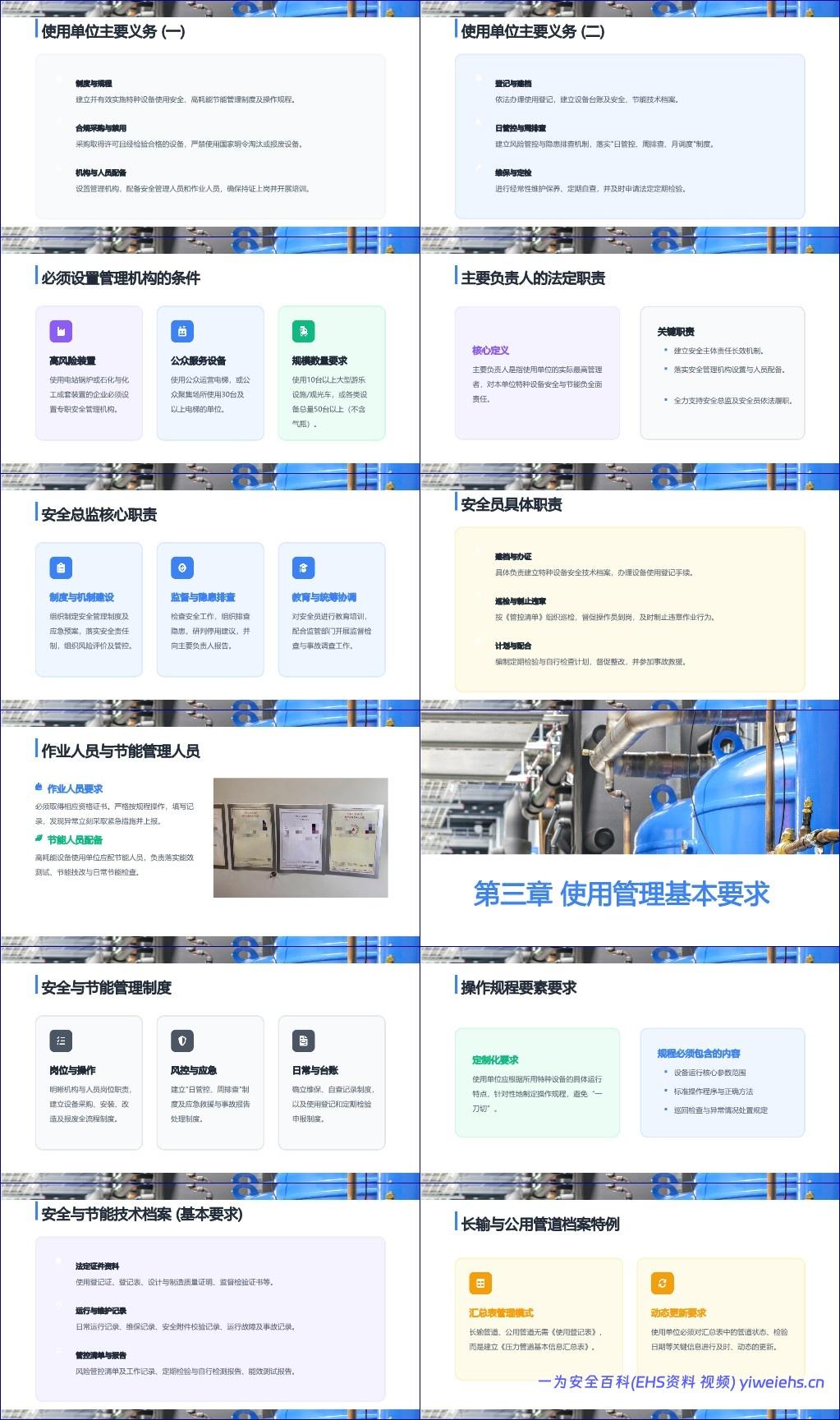 文档首先明确了“使用单位”的定义——包括拥有设备管理权的法人或自然人,并对共有、出租、托管等特殊情形下的责任归属作出规定。使用单位必须建立完善的安全与节能管理制度,配备持证的安全管理人员和作业人员,落实“日管控、周排查、月调度”机制,并依法办理使用登记,建立技术档案。