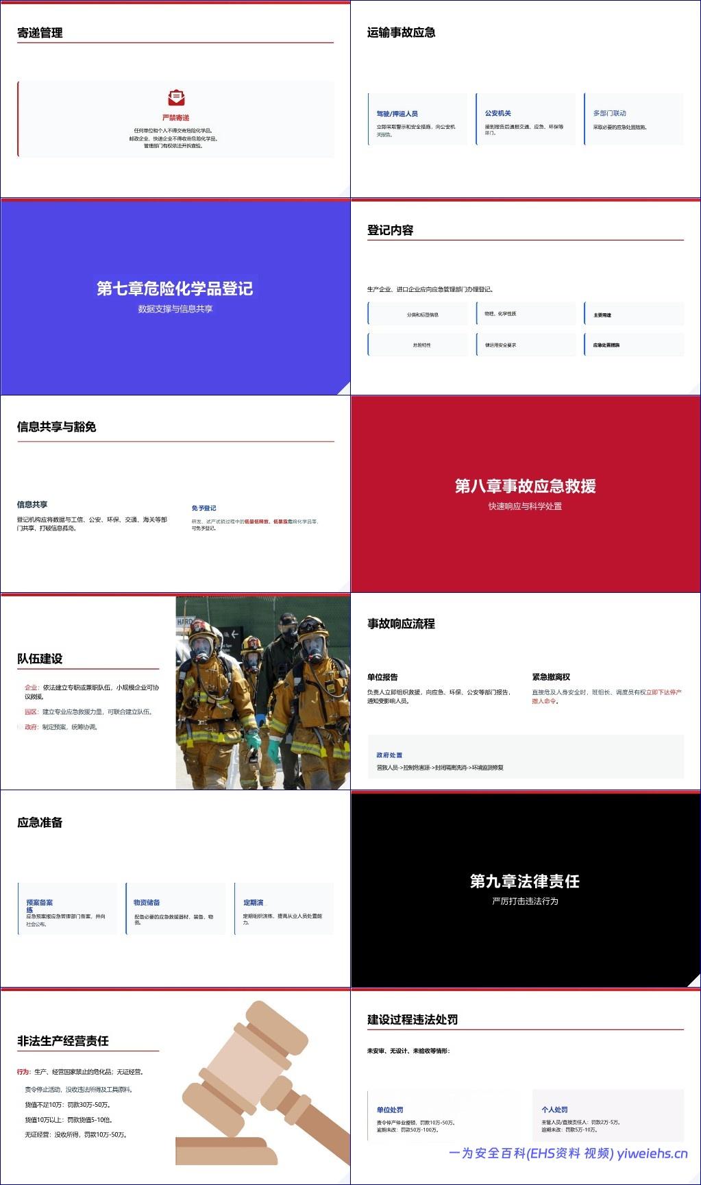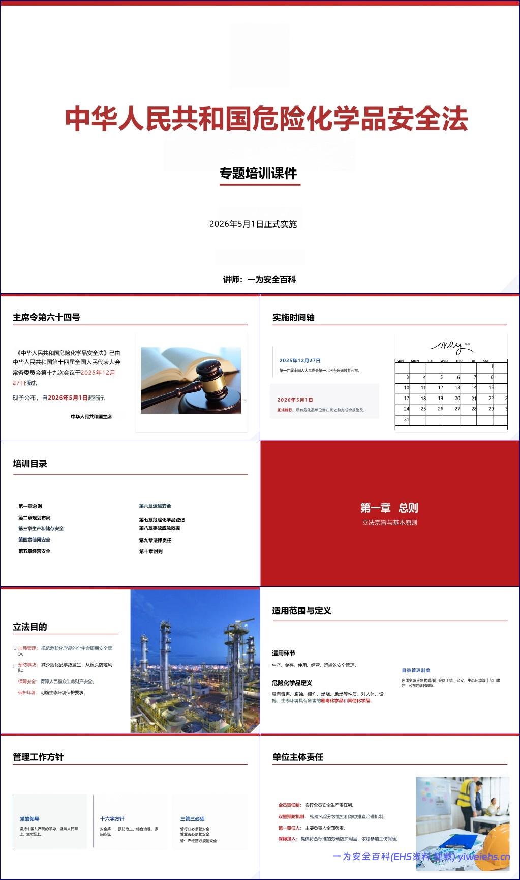 《中华人民共和国危险化学品安全法》培训课件全面系统地解读了将于2026年5月1日正式施行的新法规。该法由第十四届全国人大常委会第十九次会议于2025年12月27日通过,旨在加强危险化学品全生命周期安全管理,预防和减少事故,保障人民生命财产安全及生态环境。课件内容结构清晰,覆盖总则、规划布局、生产储存、使用、经营、运输、登记、应急救援及法律责任等十大章节。