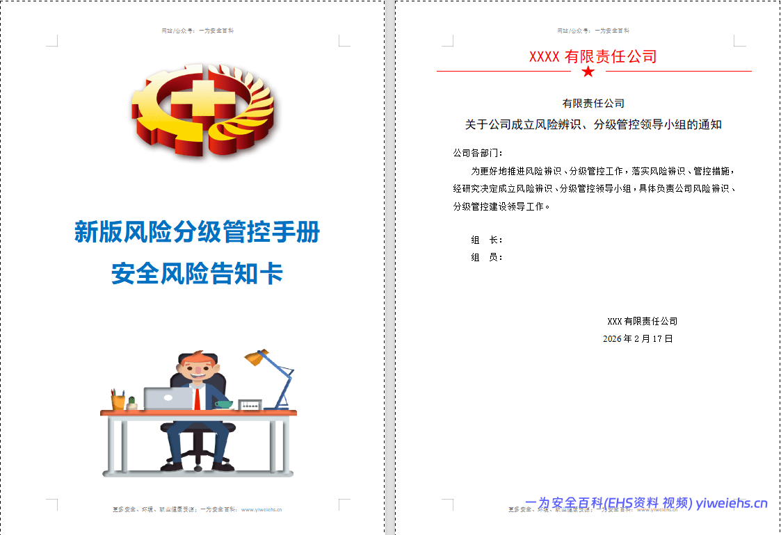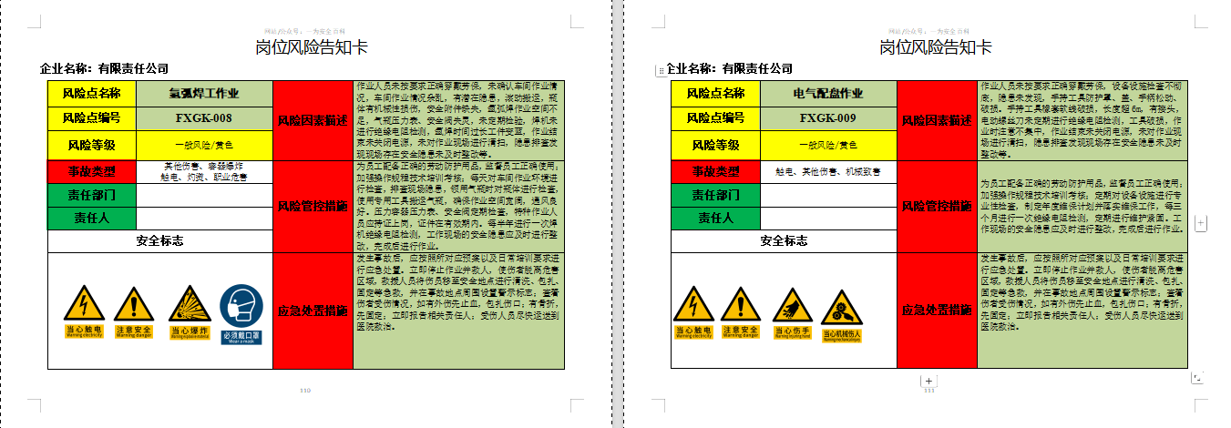 最后,文档配套提供了符合GB2894标准的风险告知卡模板,用于在作业现场醒目位置公示风险信息、应急措施及责任人,实现风险可视化、警示即时化,有效提升一线员工的风险感知与防范能力。