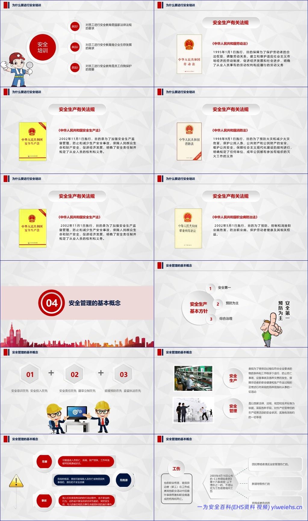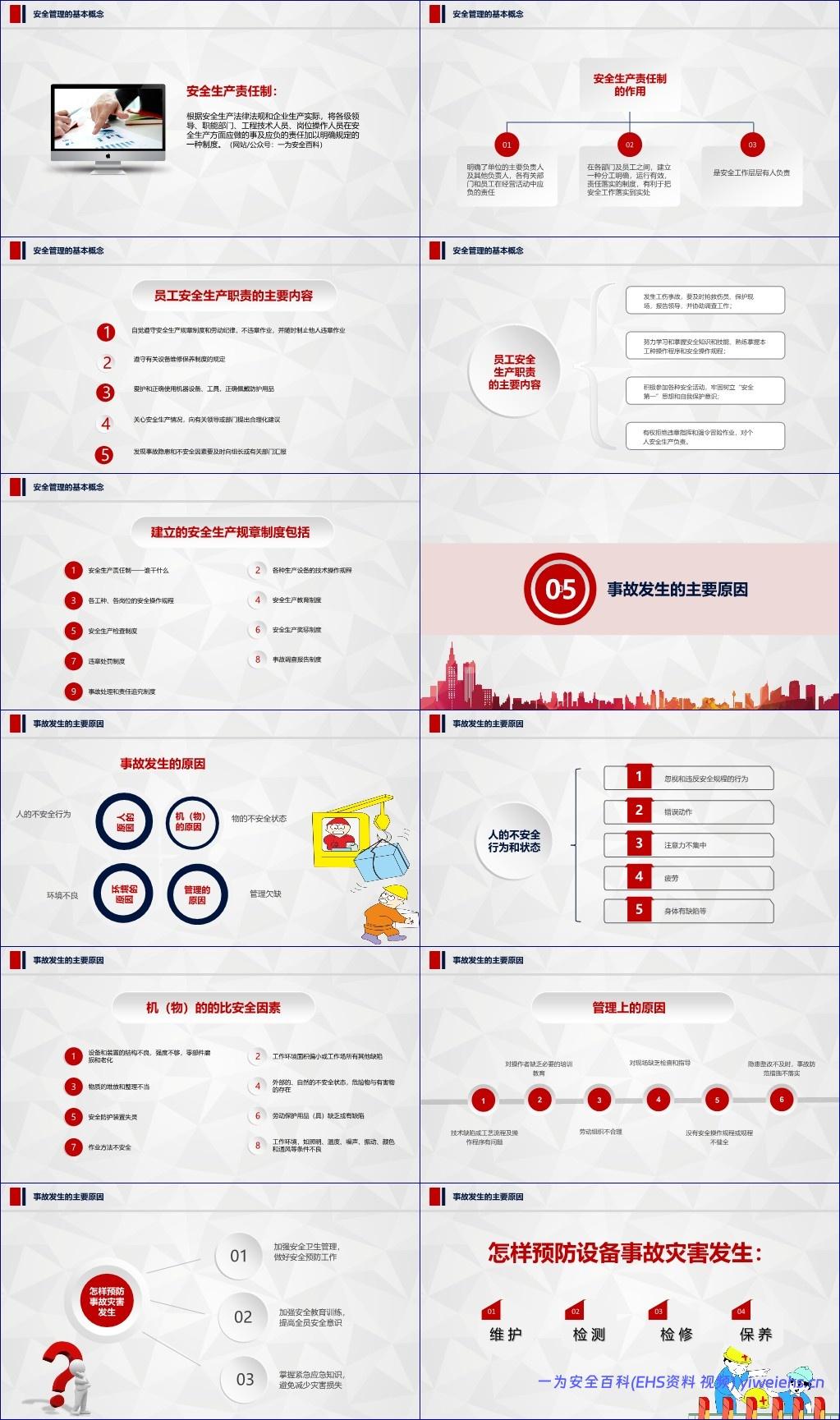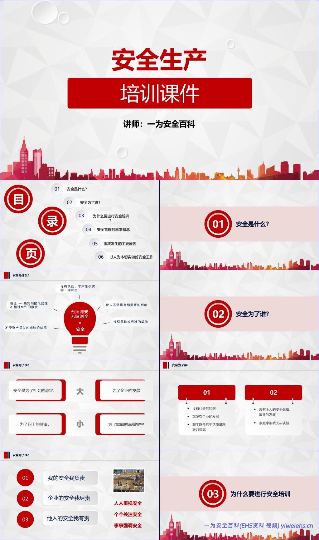 《安全生产培训课件》是一份系统性、结构化且内容详实的安全生产教育材料,旨在提升企业员工的安全意识、规范操作行为,并从法律、制度、管理及人文等多个维度全面阐述“安全”的核心要义与实践路径。该课件由“一为安全百科”提供,内容涵盖六大板块,包括“安全是什么?”“安全为了谁?”“为什么要进行安全培训?”“安全管理的基本概念”“事故发生的主要原因”以及“以人为本切实做好安全工作”。
