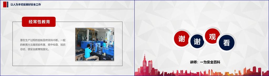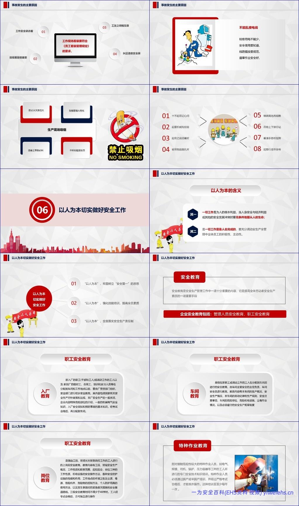 最后,课件以“以人为本”为核心理念收尾,强调一切安全工作的出发点和落脚点都应是保障人的生命与健康。当安全与效益冲突时,必须无条件服从人的生命权。为此,企业需强化安全教育培训(特别是新员工的三级安全教育和特种作业人员的专业培训),全面落实安全生产责任制,并持续开展经常性安全教育,形成“人人重视安全、事事强调安全”的文化氛围。