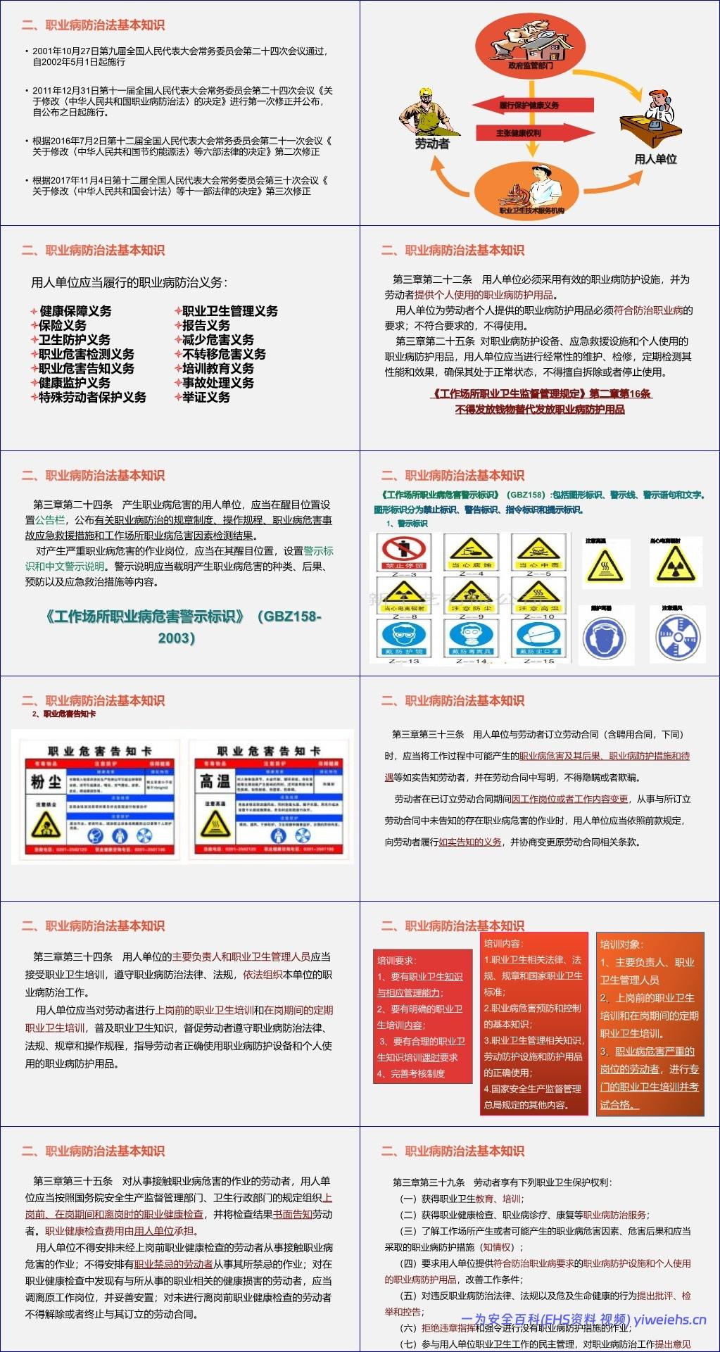 其次,文档详细解读了《职业病防治法》的核心条款。该法自2002年实施以来历经多次修订,明确了用人单位在职业病防治中的主体责任,包括提供符合标准的防护设施与个人防护用品、设置公告栏与警示标识、履行职业危害告知义务、组织职业卫生培训、承担健康检查费用等。同时,法律也赋予劳动者多项权利,如知情权、获得防护用品权、拒绝违章作业权及参与民主管理权等。值得注意的是,劳动者亦需履行学习职业卫生知识、遵守操作规程、正确使用防护用品及报告隐患等义务,形成用人单位与员工共同防控职业病的良性机制。