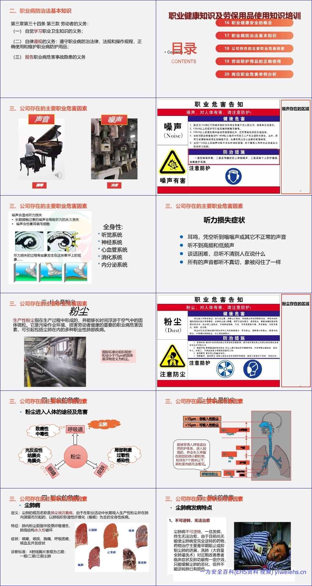 第三部分聚焦于“公司存在的主要职业危害因素”,重点分析了噪声与粉尘两大类。噪声可导致听力损失,并影响神经系统、心血管系统等多个器官;而生产性粉尘(粒径小于75μm)可通过呼吸道进入肺泡,引发尘肺病——一种不可逆、无法治愈但可防可控的严重职业病。文档特别指出,肉眼不可见的呼吸性粉尘(<7μm)才是致病元凶,即便作业现场“看起来干净”,仍需严格防护。