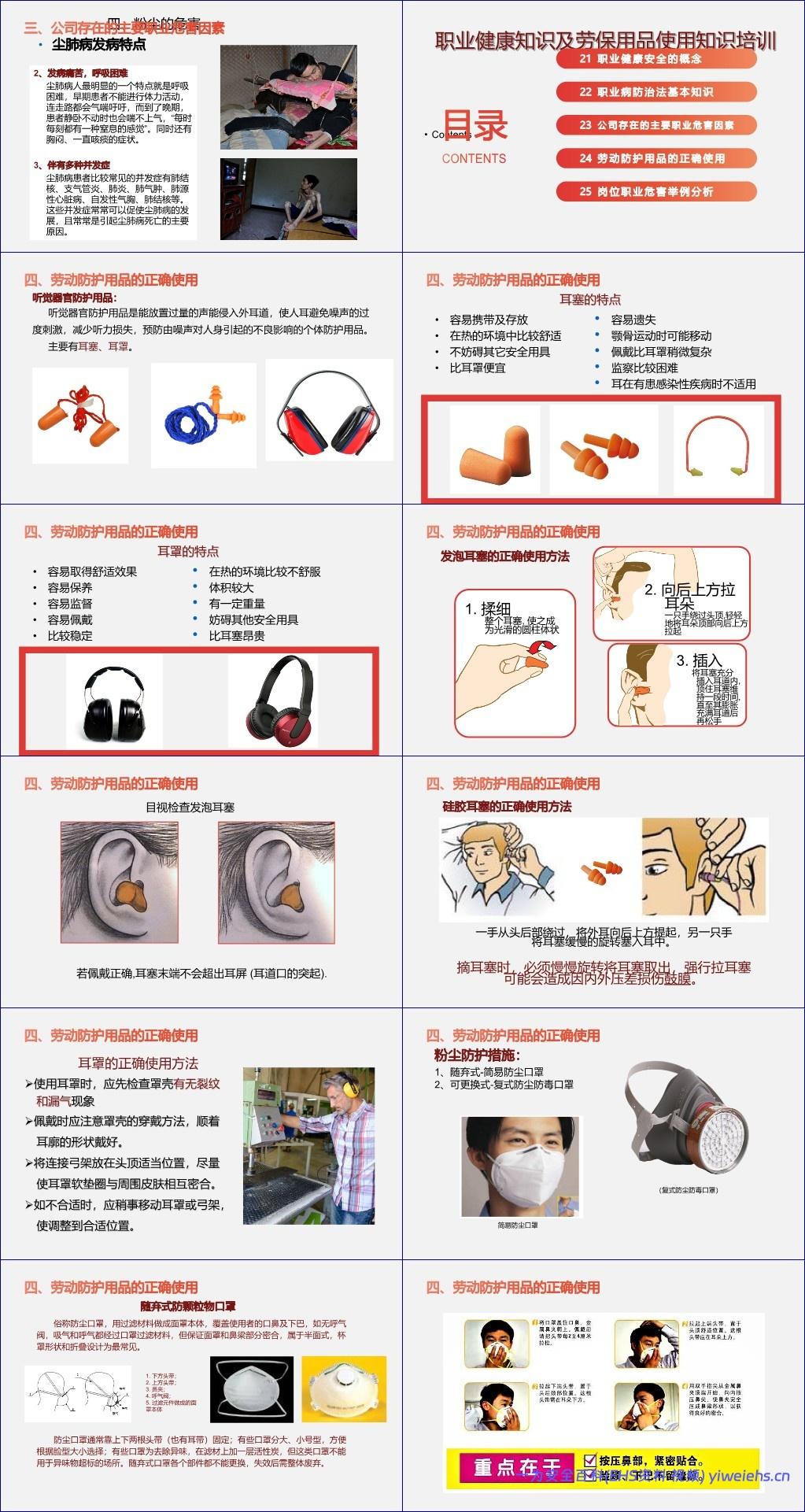在防护措施方面,文档详述了“劳动防护用品的正确使用”方法。针对噪声,推荐使用耳塞或耳罩,并演示了发泡耳塞、硅胶耳塞及耳罩的规范佩戴与摘除步骤,强调密合性与舒适性的平衡。针对粉尘,则区分随弃式(简易防尘口罩)与可更换式(复式半面罩)两类,并指出必须选用带有“LA”标志、符合GB2626-2006标准且防护等级不低于KN95的产品。文档特别警示:纱布口罩、活性炭口罩等不能替代专业防尘口罩,这是常见的错误做法。
