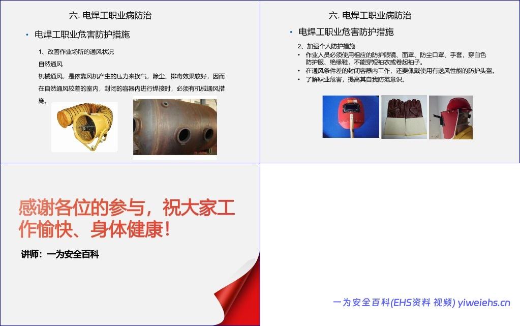 最后,文档以“电焊工职业危害”为例,进行岗位级风险分析。电焊作业产生电焊烟尘(含锰、臭氧、氮氧化物等)、强弧光(含紫外线、红外线)等多种危害,可导致电焊工尘肺、电光性眼炎、皮肤灼伤、金属烟雾热乃至锰中毒等。防护对策包括加强通风(自然+机械)、穿戴全套防护装备(防护面罩、防尘口罩、白色防护服、绝缘鞋),并在密闭空间使用送风式头盔。