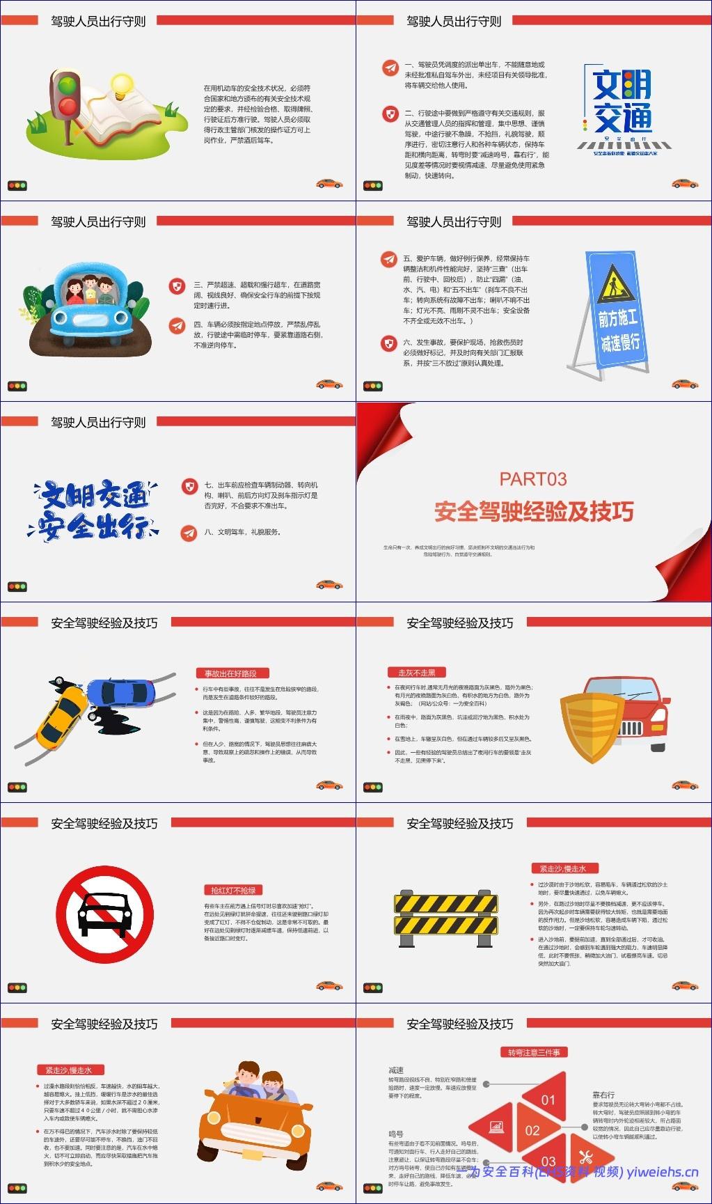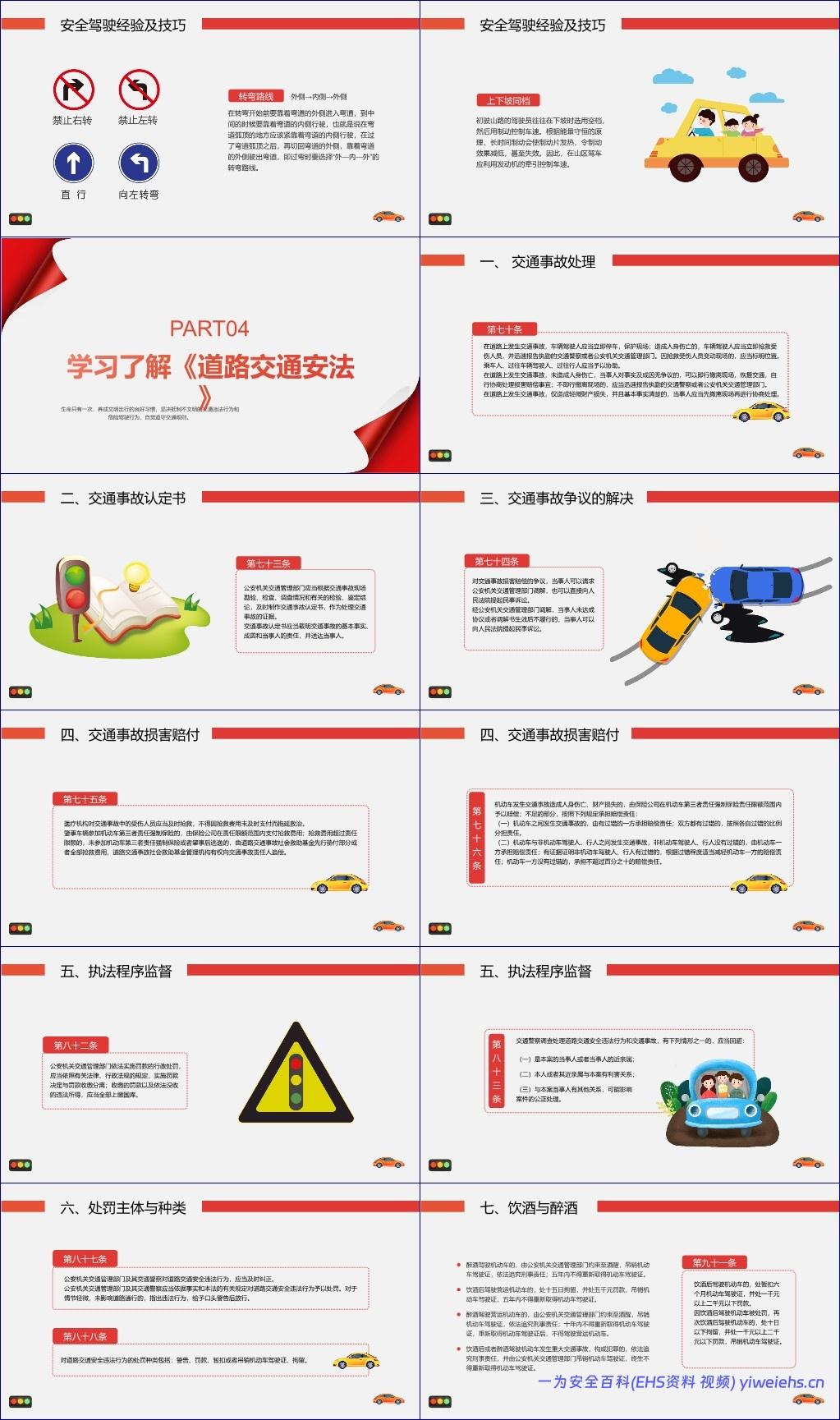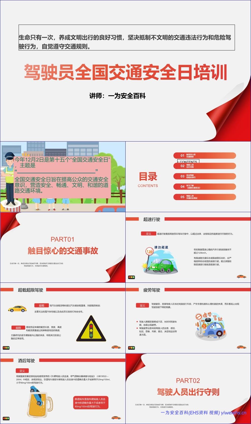 《驾驶员全国交通安全日培训》是一份围绕“交通安全”核心主题展开的系统性培训材料,旨在提升驾驶员的安全意识、规范驾驶行为、普及交通法规,并通过真实案例与实用技巧强化道路安全文化。该文档结构清晰,共分为五个主要部分:触目惊心的交通事故、驾驶人员出行守则、安全驾驶经验及技巧、学习了解《道路交通安全法》以及驾驶人员交通安全测试。