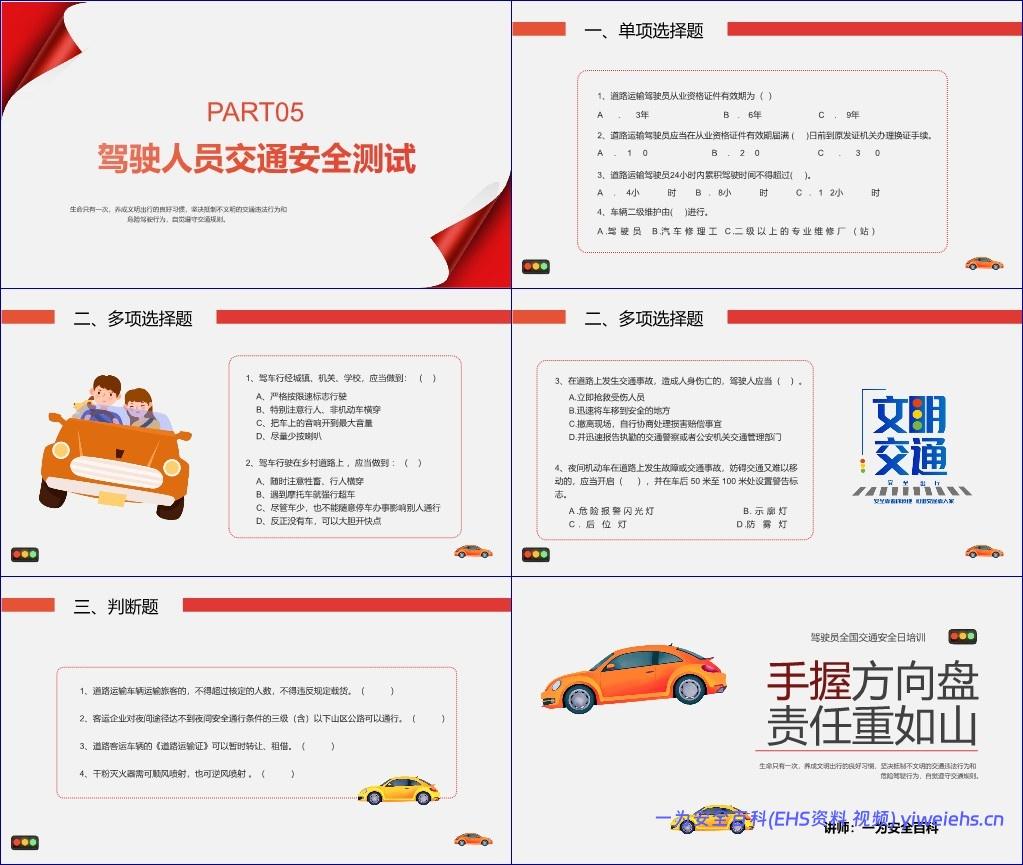 最后,“驾驶人员交通安全测试”通过单选、多选和判断题形式检验学习成效,涵盖从业资格管理、驾驶时间限制、车辆维护责任、事故处置流程、夜间应急措施等知识点,进一步巩固培训效果。