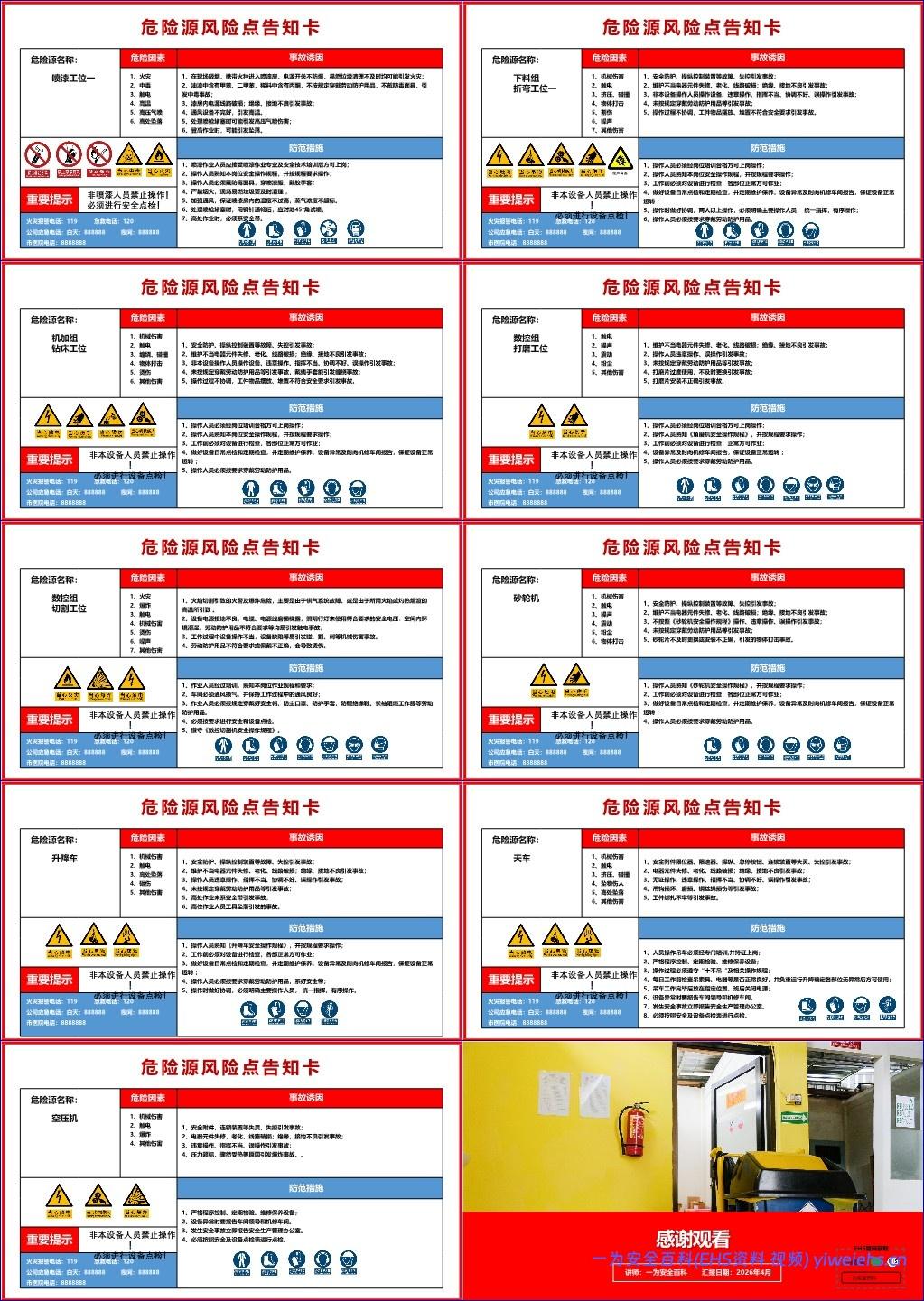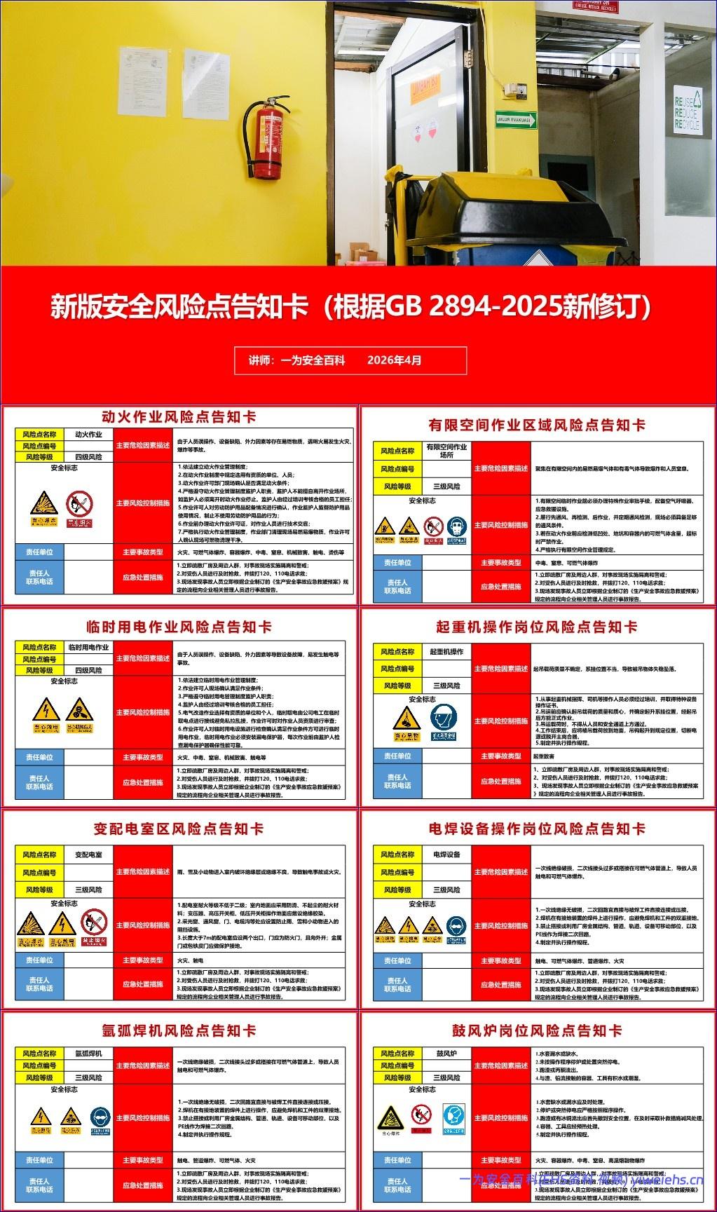 该文档是依据GB 2894-2025新修订标准制作的安全风险点告知卡PPT,由“一为安全百科”于2026年4月发布。其核心内容是针对各类作业场所、设备和操作岗位(如动火作业、有限空间、临时用电、起重机、变配电室、电焊、叉车、油库、污水处理池等)进行系统性的安全风险识别与管控。
