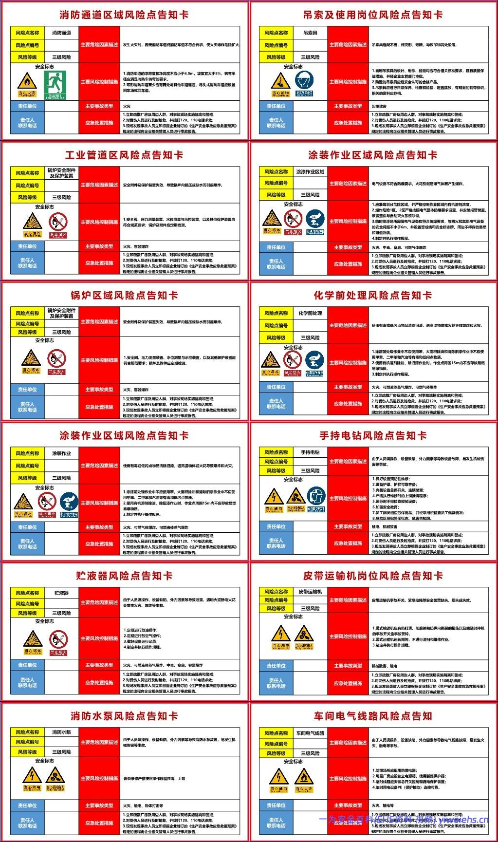 每张告知卡均详细列出了风险点名称、主要危险因素描述(如易燃物质遇明火、设备缺陷、有毒气体聚集等)、风险等级(从二级到四级不等)、主要事故类型(如火灾、爆炸、触电、中毒、机械伤害等)、主要风险控制措施(包括建立管理制度、人员资质要求、作业许可、个人防护、设备检查、通风检测等)以及应急处置措施(如疏散、警戒、抢救、报警等)。此外,还包含了一些通用的危险源风险点告知卡,强调了特定工位(如喷漆、下料、机加、数控等)的具体危害、事故诱因和防范措施。