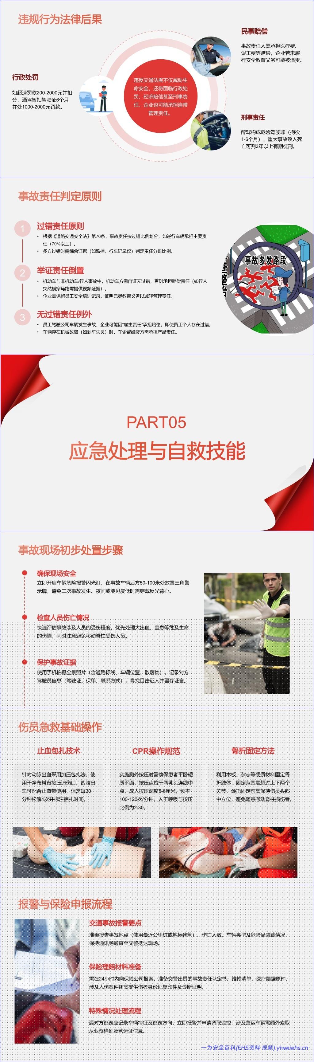 然后,它强调了交通法规的重要性。闯红灯、超速这些不只是罚款扣分那么简单,万一出了大事,可能还要负刑事责任,企业也可能因为没管好员工而担责。这里就引出了一个核心:事故责任怎么划分?通常是谁有错谁负责,但机动车撞了行人或非机动车,就算你没错也得想办法证明,不然就得赔钱。