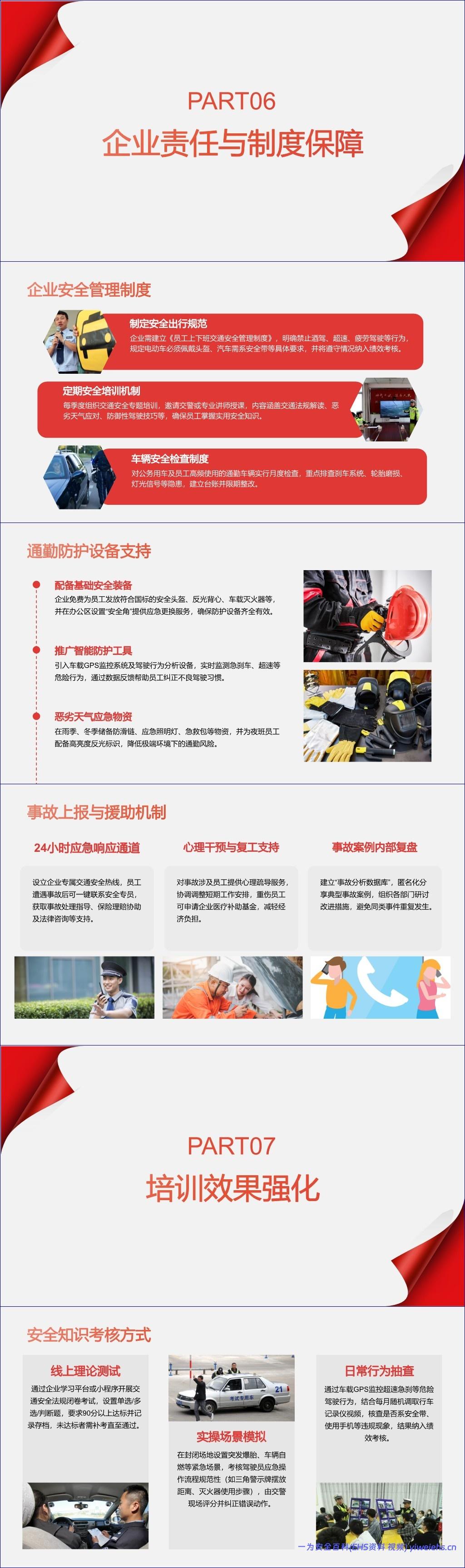 最后,这份材料还提到了企业的责任。公司不能光让员工自己注意,还得制定制度、组织安全培训、给员工配发头盔反光衣,甚至建立24小时的应急热线,形成一个完整的安全保障体系。