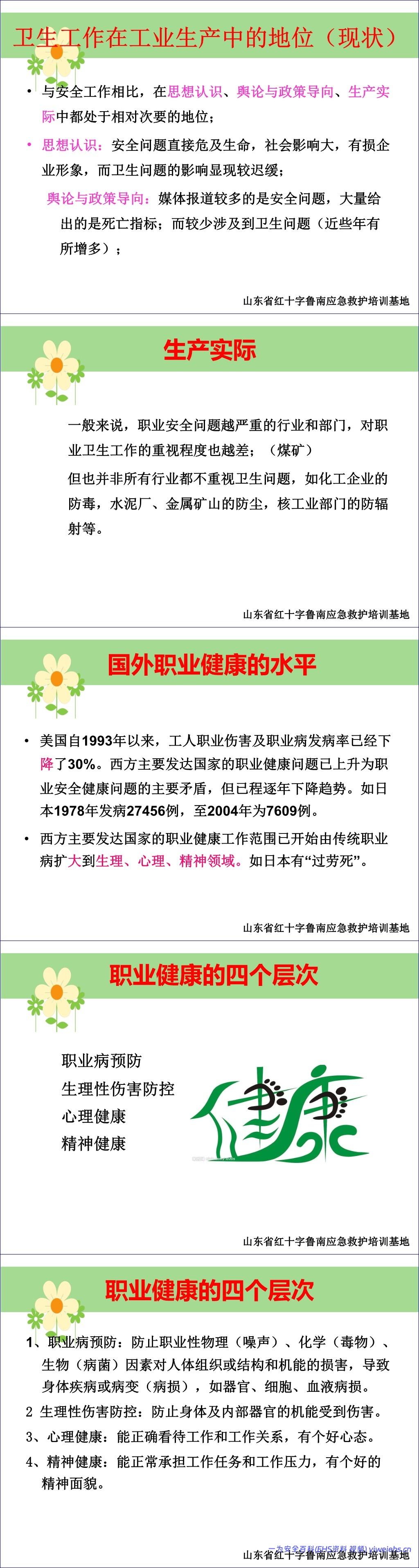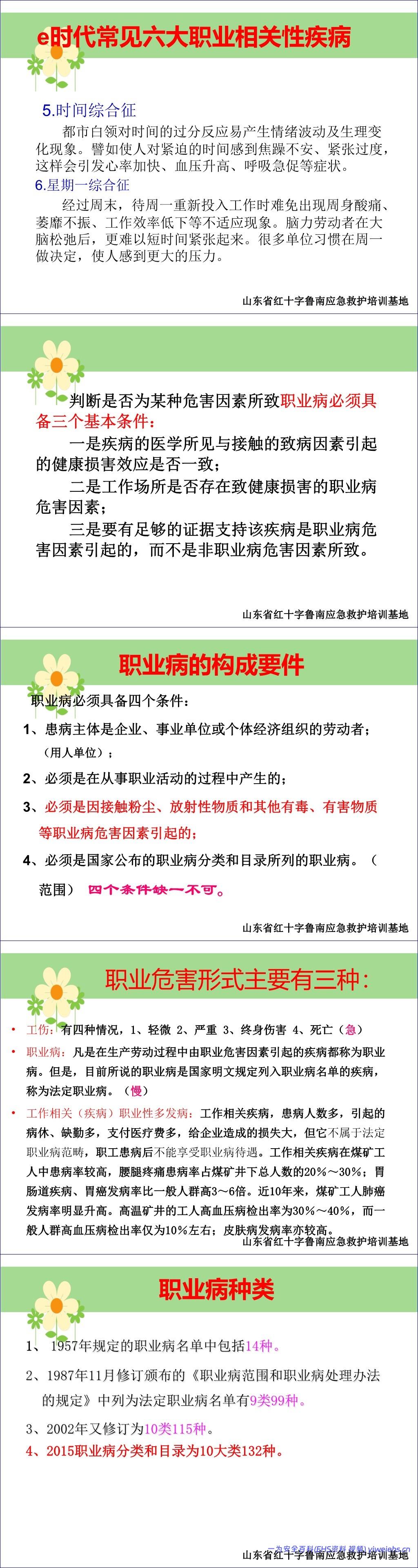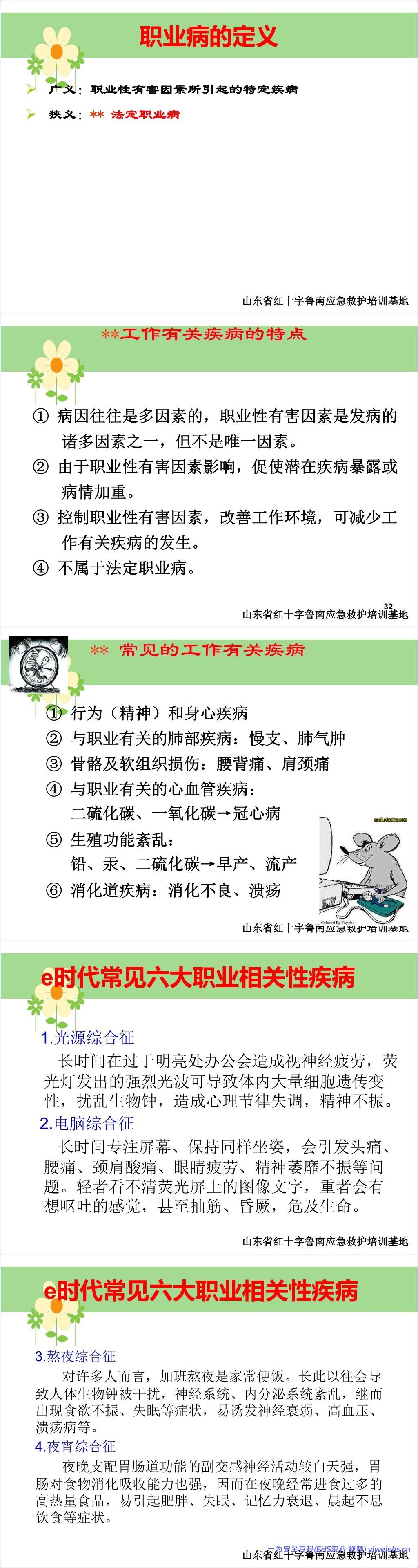 内容围绕职业健康的多层次展开,从基本定义到具体危害因素,再到防治策略,结构严谨。特别指出e时代六大职业相关性疾病(如电脑综合征、熬夜综合征等),贴近现代职场人群实际。同时,通过对比职业安全与职业健康的异同,阐明二者相互转化、不可割裂的关系。讲座还引用大量国内外统计数据,凸显我国职业病形势严峻,呼吁建立完善的保障机制、加强监管与教育。