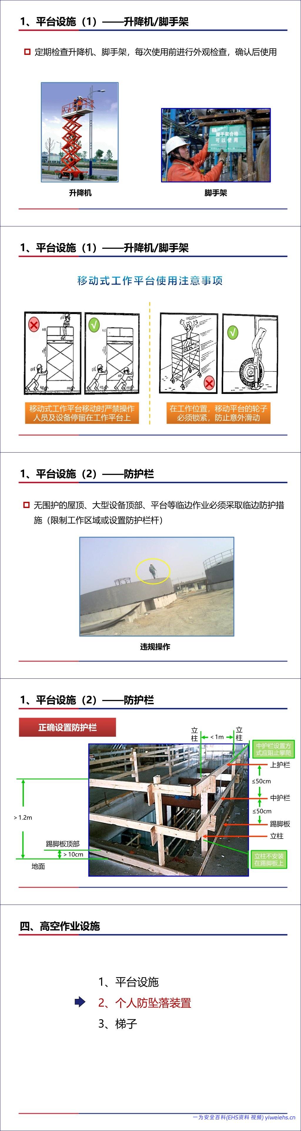 平台设施:推荐使用升降机、脚手架等,并详细说明了其检查、使用及防护栏设置标准。