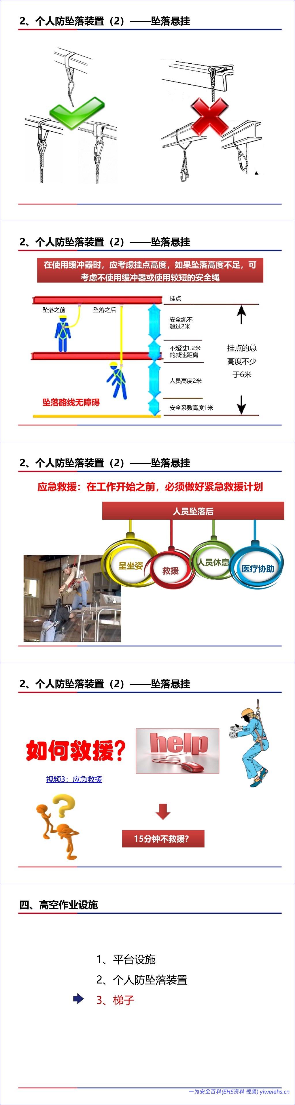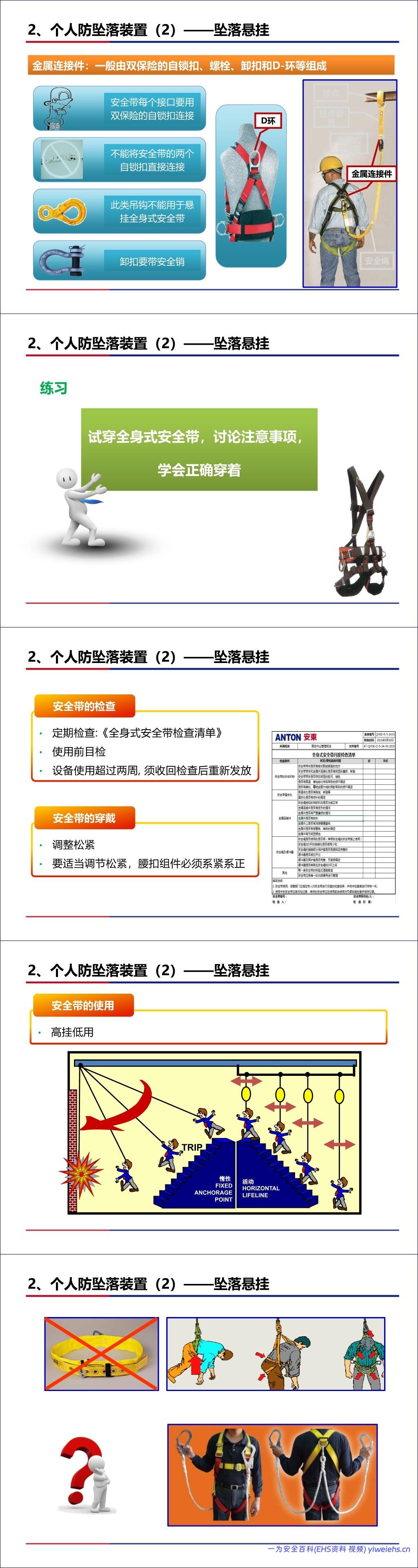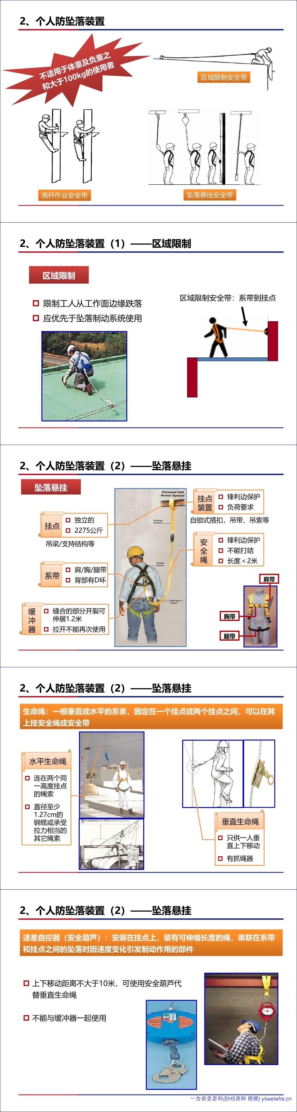 个人防坠落装置:区分了区域限制安全带和坠落悬挂安全带(全身式安全带)的用途,并详解了挂点、安全绳、缓冲器、生命绳、速差自控器等组件的正确选择、检查与使用方法(如高挂低用、双挂钩移动),以及坠落后的应急救援措施。