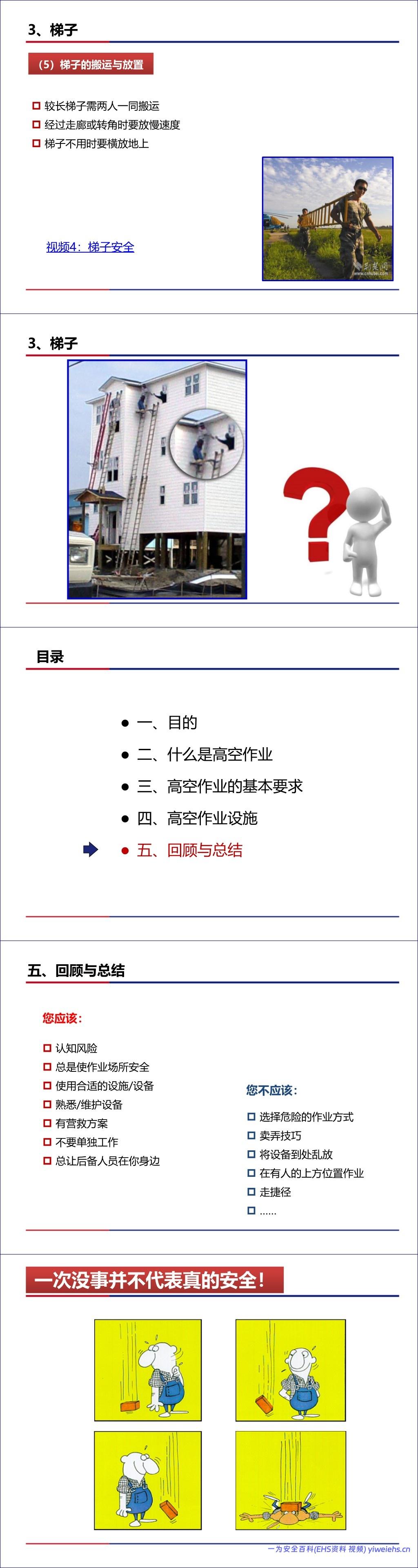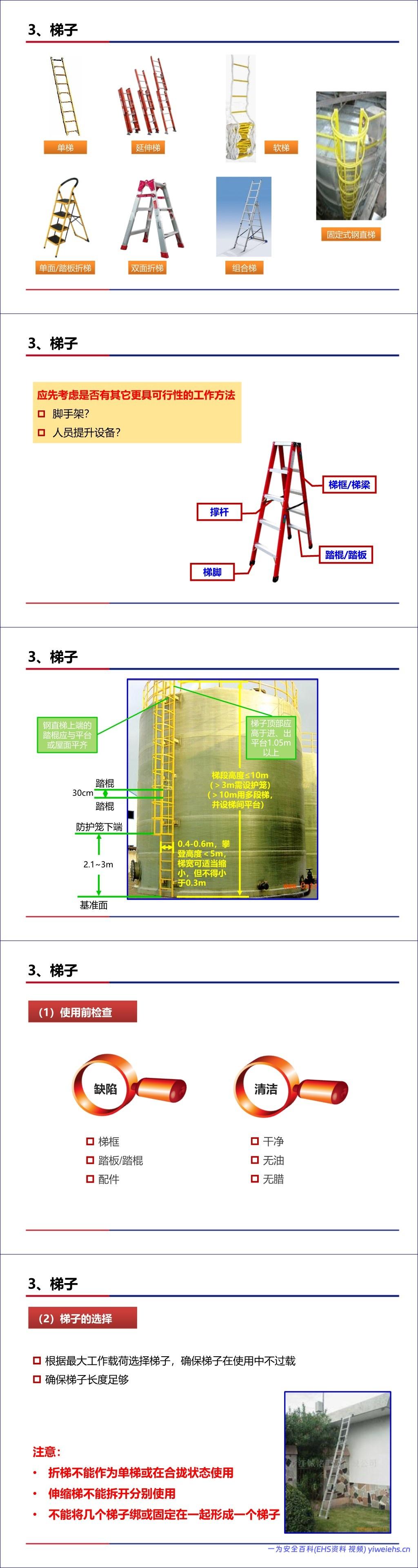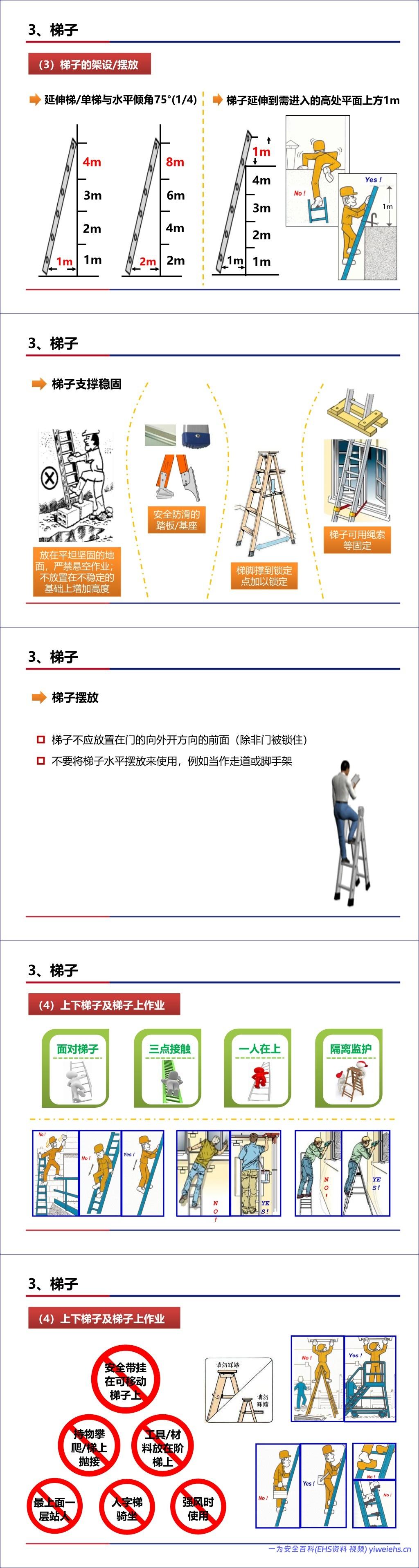 梯子:涵盖了各种梯子(延伸梯、折梯、钢直梯等)的选择、架设(75°倾角)、检查、上下梯规范(三点接触、面对梯子)及禁止行为。