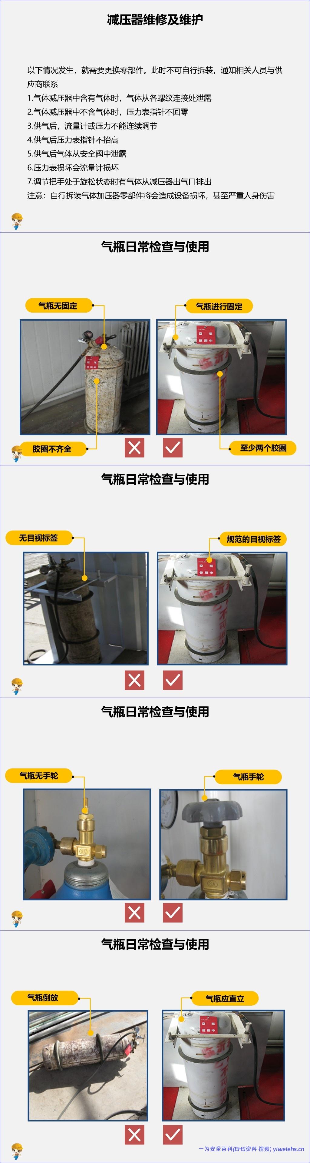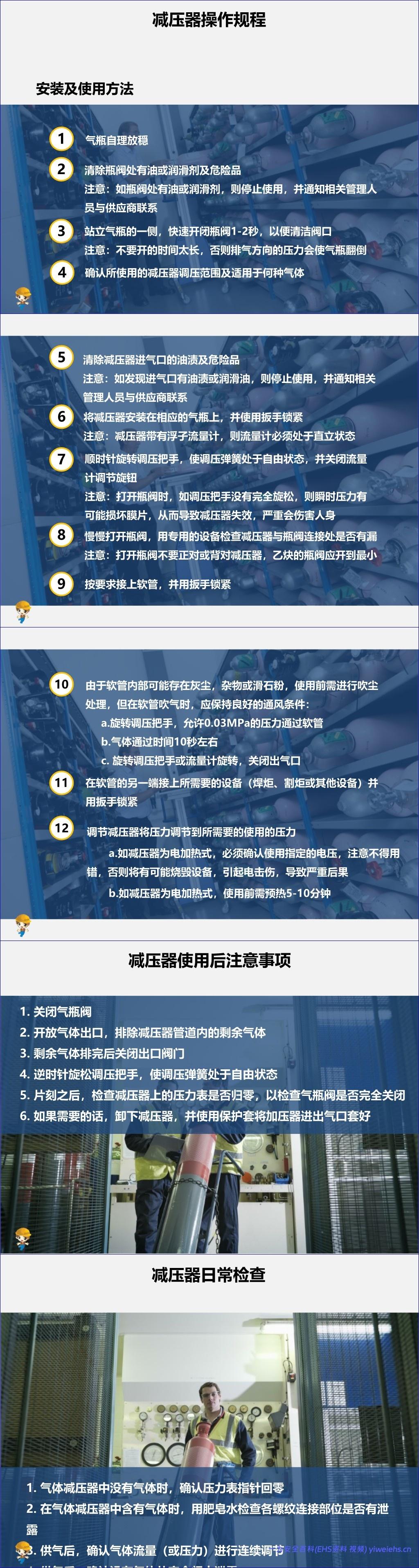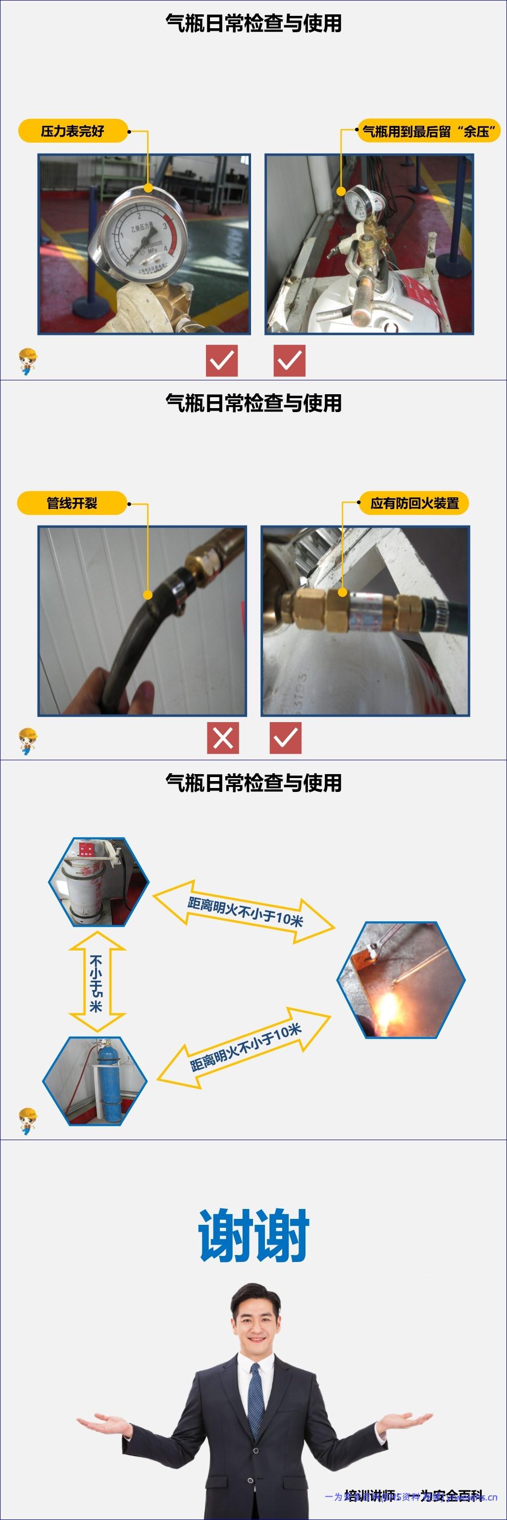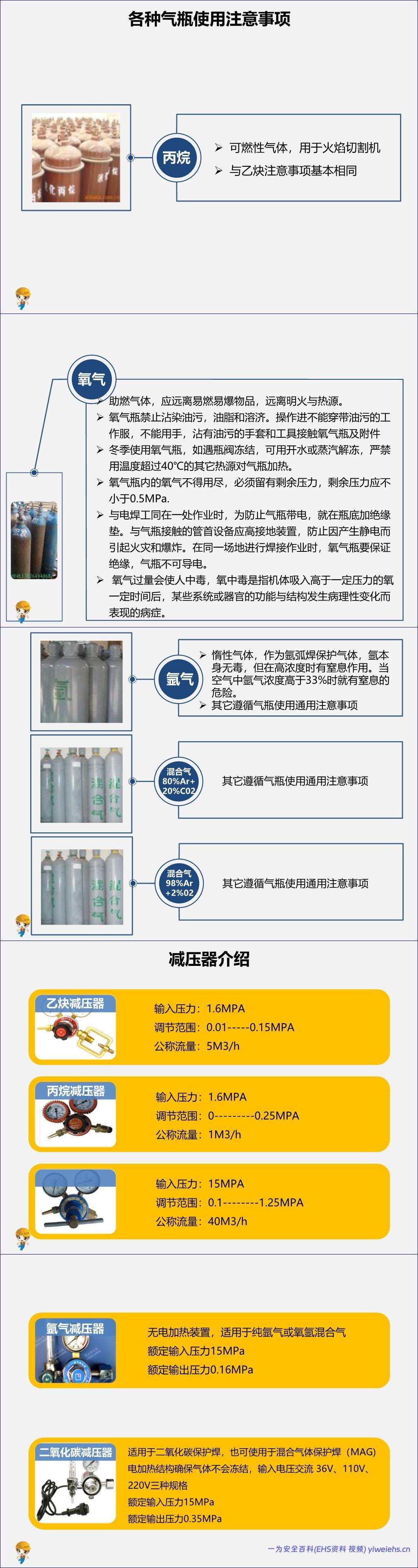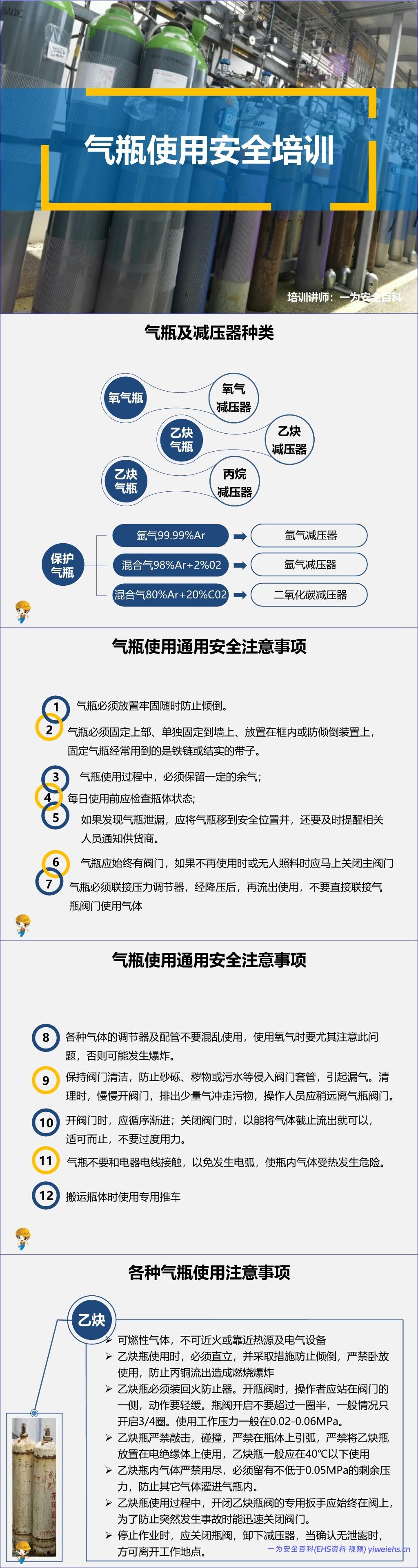 该文档《气瓶使用安全培训》详细介绍了气瓶及减压器的种类、通用安全注意事项、各类气体(如乙炔、丙烷、氧气、氩气等)的特定使用规范,以及减压器的操作规程、日常检查与维护要求。内容强调了气瓶安全的核心原则,包括防止倾倒、保留余压、远离火源热源、正确使用减压器等。特别针对乙炔瓶,指出必须直立使用、安装回火防止器,并严禁用尽气体。对于氧气瓶,则重点警示禁止接触油污,并需留有不低于0.5MPa的剩余压力。文档还规范了减压器操作流程,从安装前的清洁检查到使用后的泄压归零,并明确了日常检查中需关注的泄漏、压力表归零等问题。所有操作都旨在保障气瓶使用过程中的人员与环境安全,符合安全培训的基本要求。