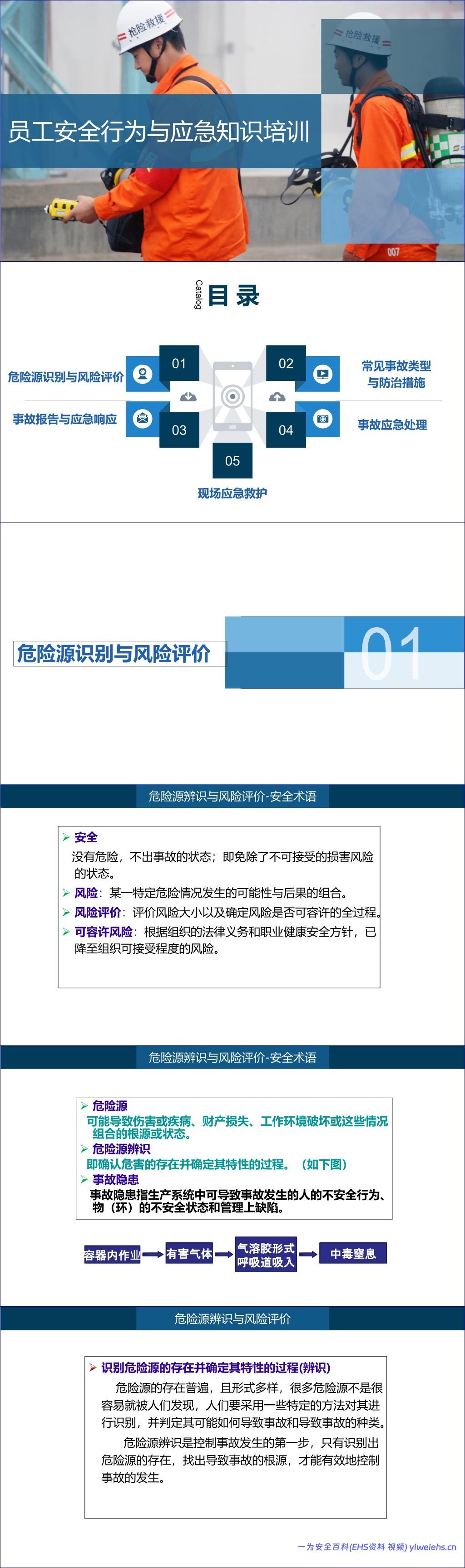 该文档《员工安全行为与应急知识培训》全面系统地介绍了企业员工在工作场所中应掌握的安全行为规范和应急处理知识,内容涵盖危险源识别、常见事故类型及防治、事故应急响应流程以及现场应急救护技能等。