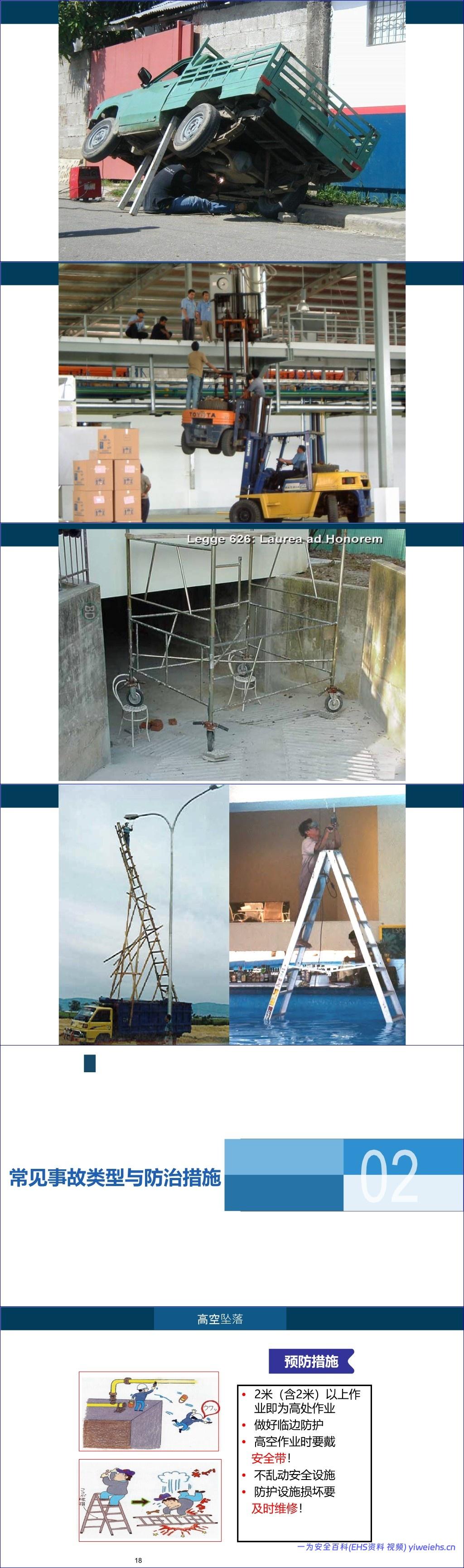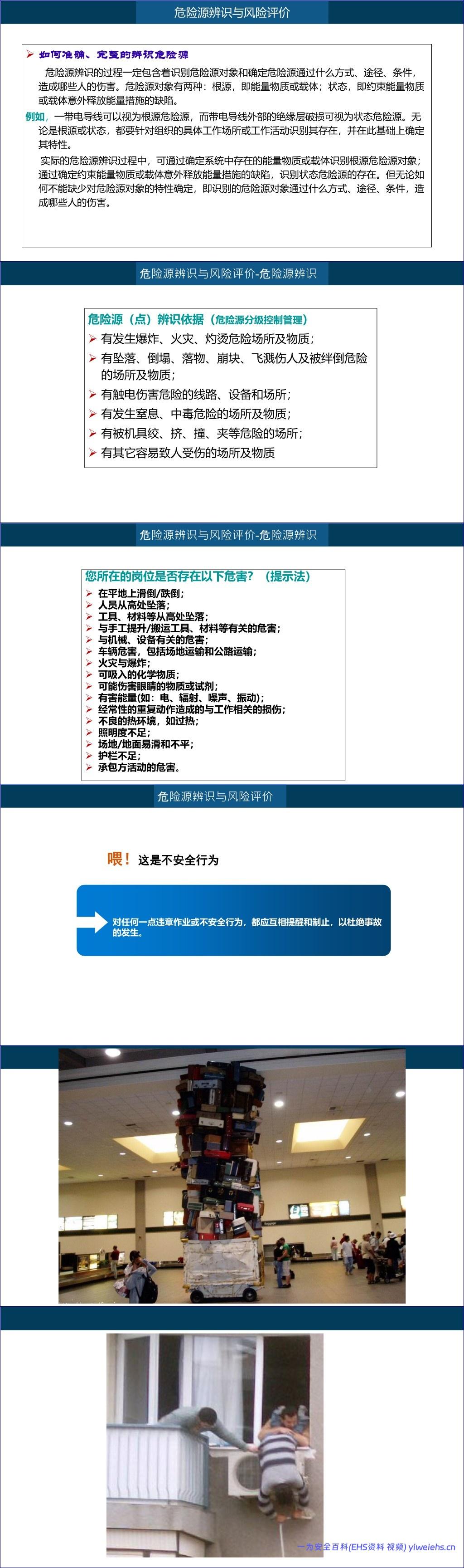 首先,在危险源识别与风险评价部分,文档定义了安全、风险、危险源等核心概念,并强调危险源辨识是控制事故的第一步。危险源分为“根源”(如能量物质)和“状态”(如防护措施缺陷),并列举了包括高处坠落、触电、机械伤害、火灾爆炸、中毒窒息等在内的多种危险场景。通过提示法引导员工自查岗位是否存在滑倒、坠落、化学品暴露、噪声振动等危害,倡导“四不伤害”原则(不伤害自己、不伤害他人、不被他人伤害、保护他人不受伤害)。