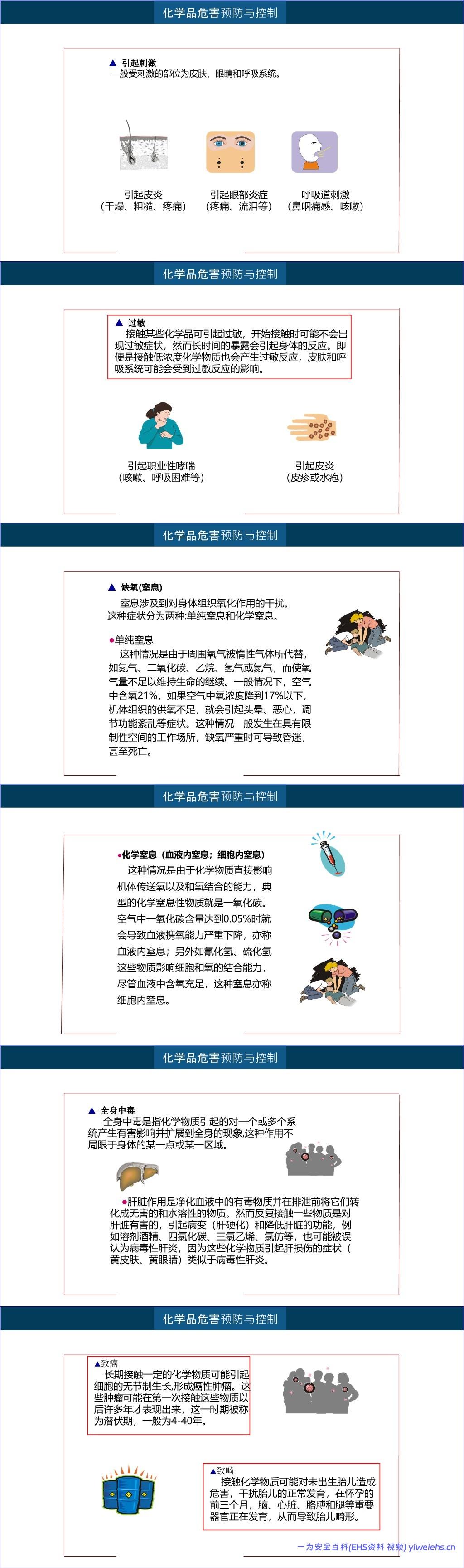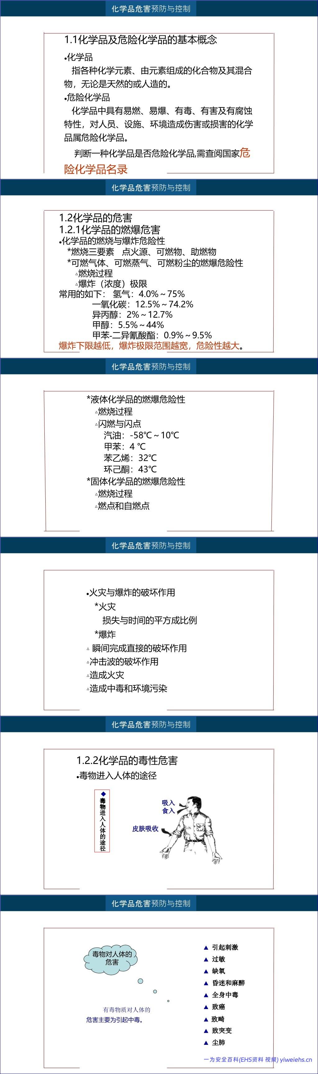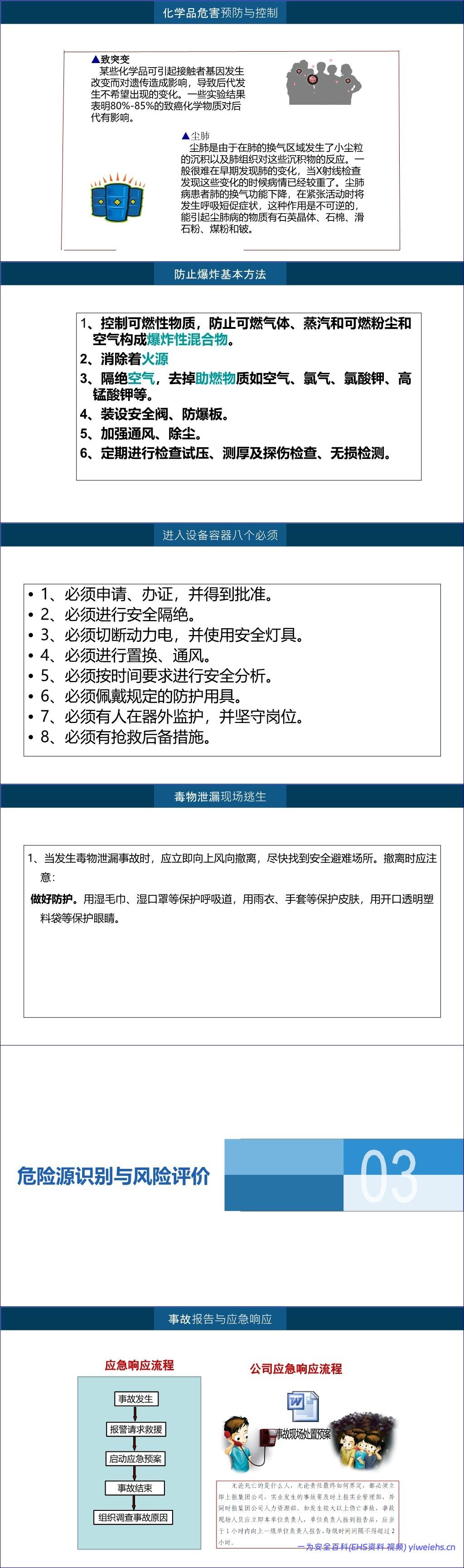 其次,常见事故类型与防治措施详细分析了高处作业、物体打击、触电、机械伤害、火灾爆炸、坍塌及受限空间作业中的窒息中毒等事故的成因与预防方法。特别针对化学品危害进行了深入讲解,包括其燃爆特性(如爆炸极限、闪点)、毒性作用途径(吸入、食入、皮肤吸收)及其对人体的多种危害,如刺激、过敏、缺氧、全身中毒、致癌、致畸、致突变和尘肺等。同时提出了防止爆炸的六大基本方法和进入设备容器的“八个必须”安全准则。