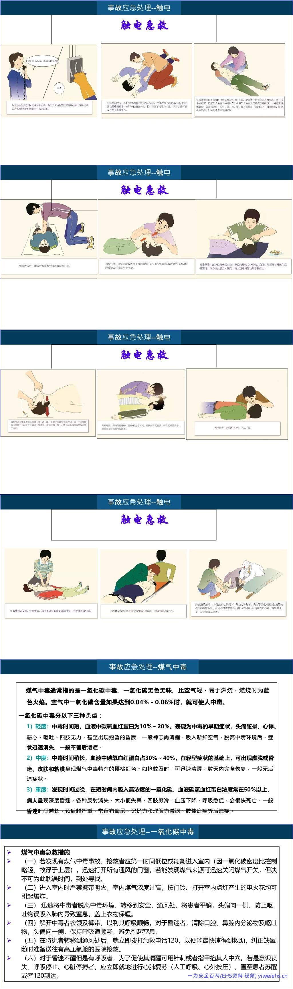 第三,在事故报告与应急响应方面,文档明确了“边报警边扑救、先救人后救物、防中毒防窒息”等应急原则,并详细说明了如何正确拨打119报火警。事故应急处理章节则提供了火灾、触电、煤气(一氧化碳)中毒等紧急情况下的具体避险与处置措施,包括灭火器的选择与使用、触电急救(断电、人工呼吸、心脏按压)以及煤气中毒的现场抢救步骤。