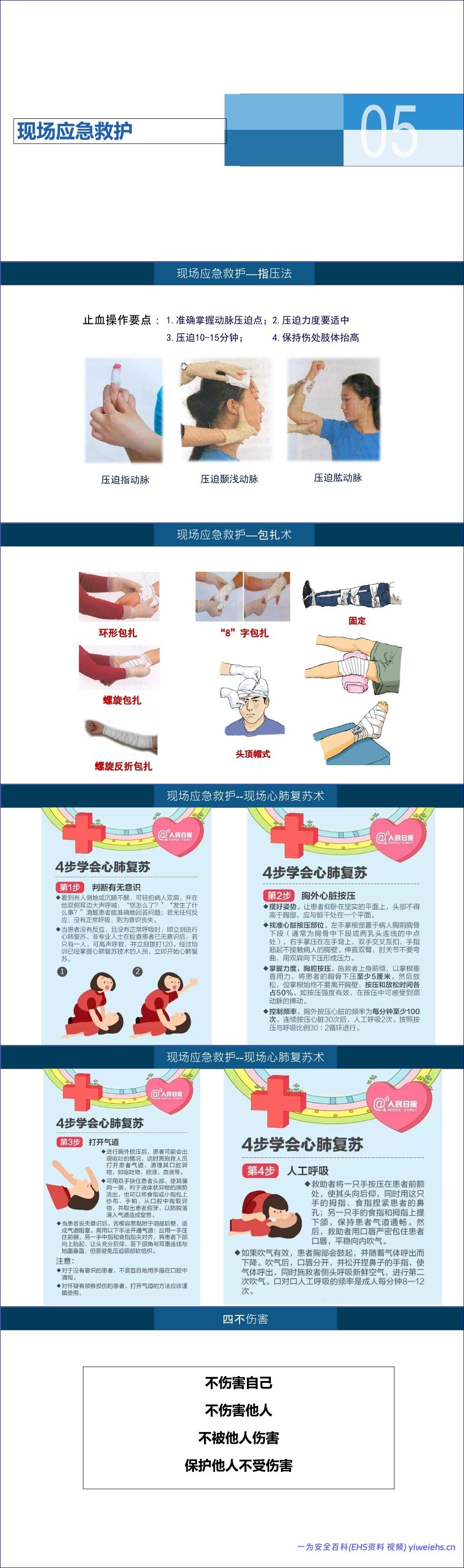 最后,现场应急救护部分教授了指压止血、包扎术(环形、螺旋、“8”字等)和心肺复苏术等基础急救技能。此外,文档还强调了员工上岗的基本要求,如穿戴劳保用品、禁烟禁酒,并提出了“三清”(清楚阀门、控制点、工艺指标)、“四懂”(懂原理、构造、性能、流程)、“五会”(会开停、操作、保养、排故)的专业能力标准。