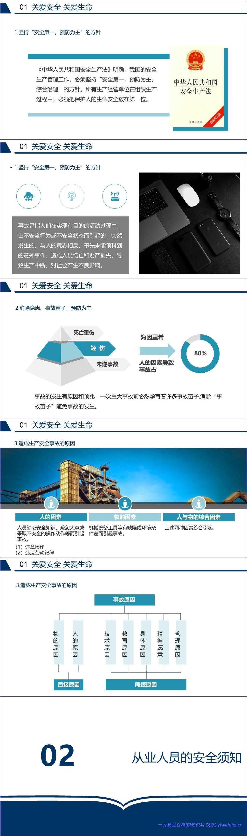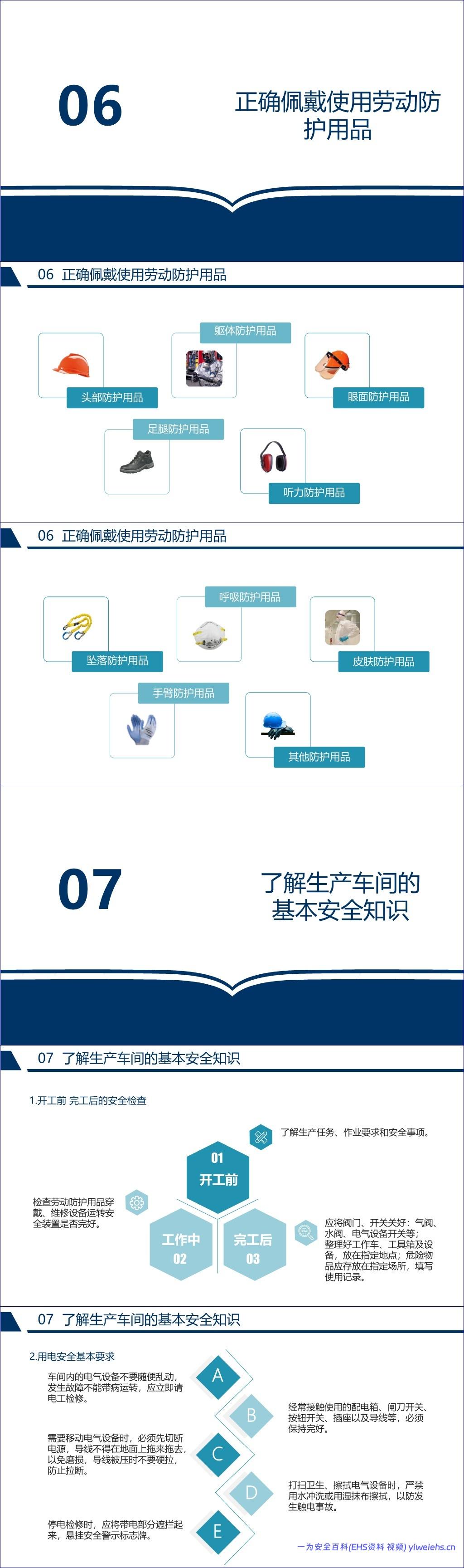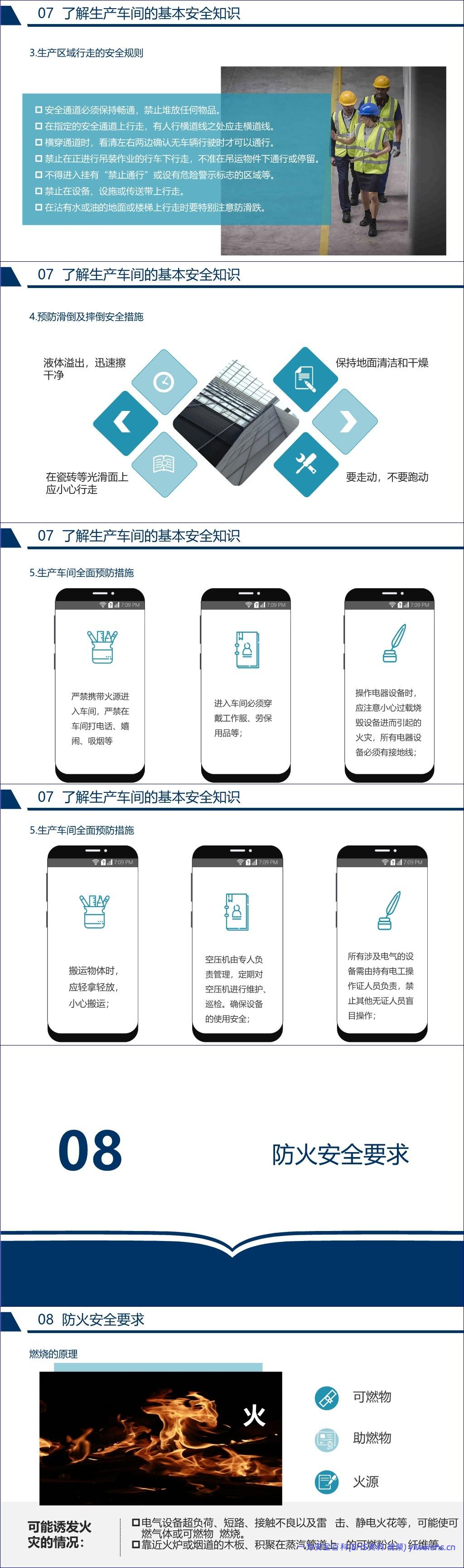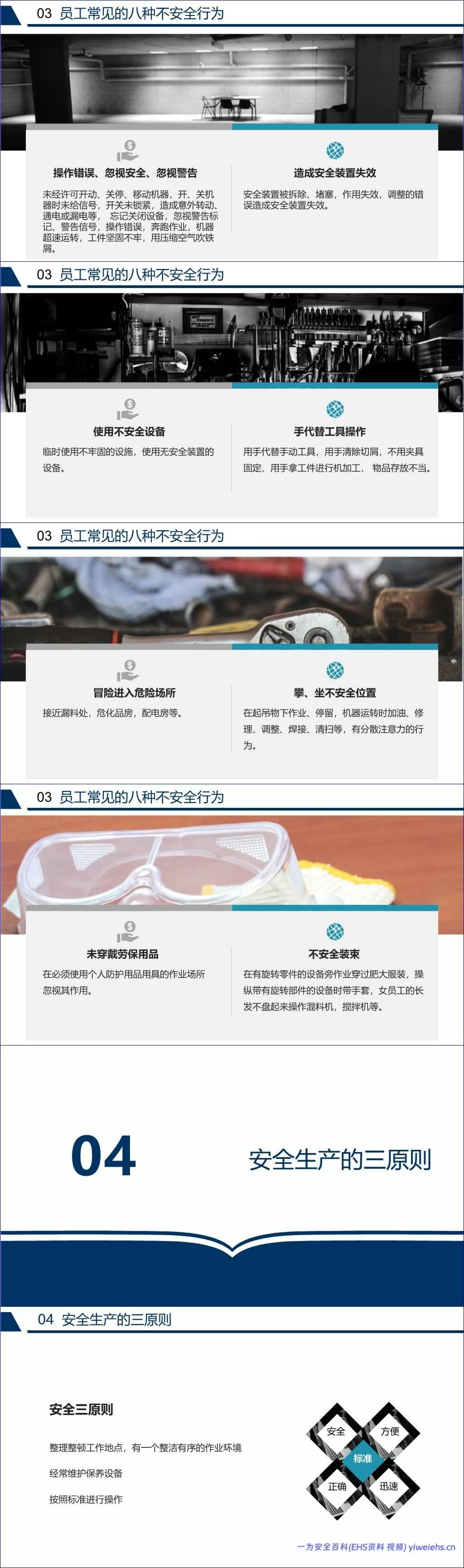 该车间级安全培训文档内容全面详实,围绕“安全生产”核心展开,系统阐述了从业人员须知、不安全行为识别、安全原则、防护措施及事故处理等关键内容。文档首先强调“安全第一,预防为主”的方针,指出事故多由人的不安全行为(占比80%)和物的不安全状态引起,并介绍了海因里希法则以警示隐患苗子的重要性。在从业人员安全须知部分,明确了“四不伤害”、“三违”现象、“三不放过”原则以及员工的十大权利与四项义务,并特别强调了“劳动防护用品”的正确佩戴与使用。文档还列举了员工常见的八种不安全行为,如操作错误、用手代替工具、冒险进入危险场所等,并提出了安全生产的三大原则:整理整顿作业环境、维护保养设备、按标准操作。此外,内容涵盖了安全警示标志的识别、生产车间用电与行走安全、防火安全要求(包括灭火器适用范围)、伤亡事故等级分类以及工伤认定的具体情形。最后,文档将安全意识延伸至日常生活,再次重申了“管生产必须管安全”和“安全生产人人有责”的基本原则,深刻揭示了“只有安全,才是效益”的核心理念。