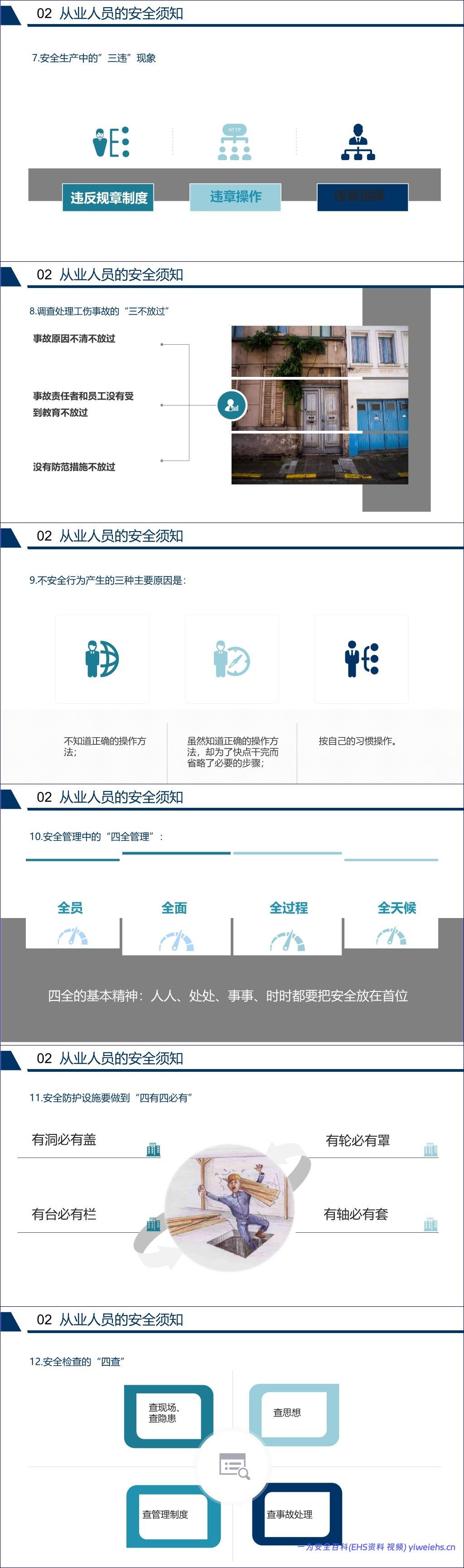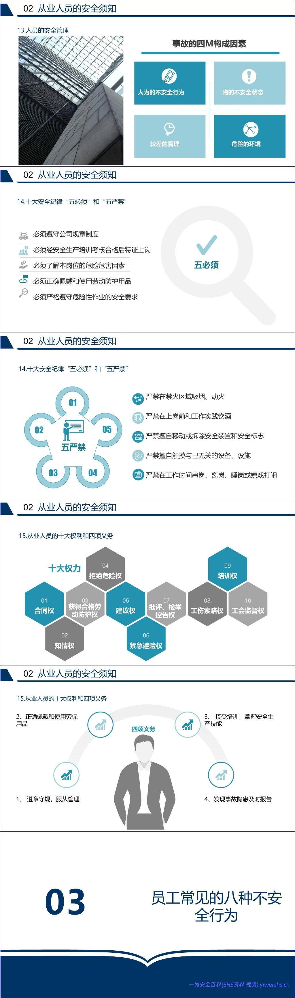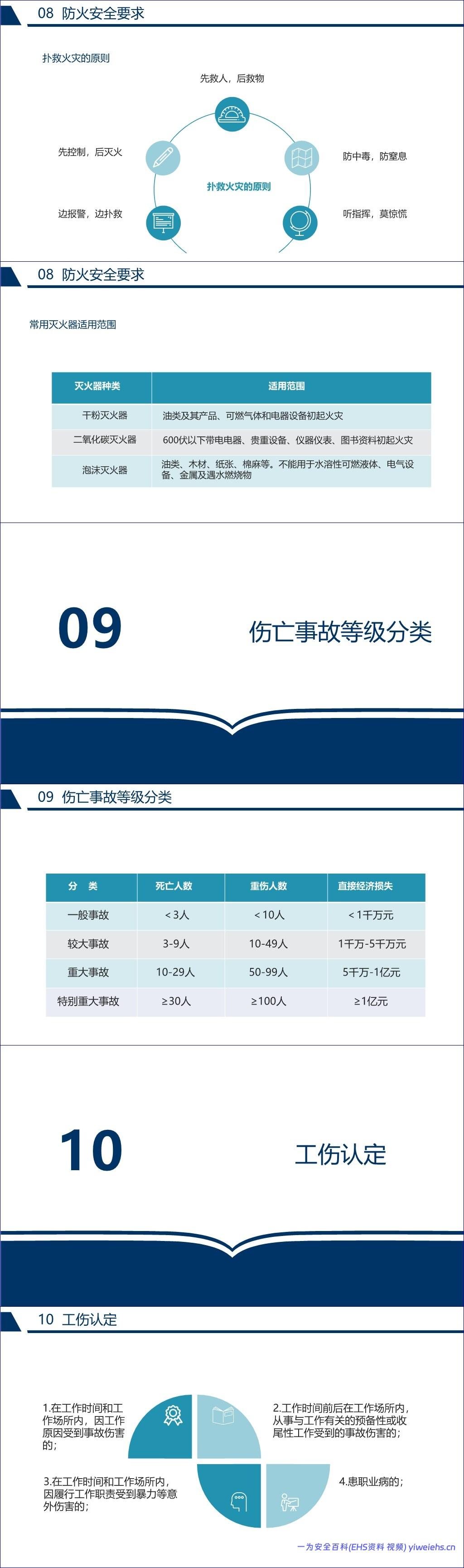 该车间级安全培训文档内容全面详实,围绕“安全生产”核心展开,系统阐述了从业人员须知、不安全行为识别、安全原则、防护措施及事故处理等关键内容。文档首先强调“安全第一,预防为主”的方针,指出事故多由人的不安全行为(占比80%)和物的不安全状态引起,并介绍了海因里希法则以警示隐患苗子的重要性。在从业人员安全须知部分,明确了“四不伤害”、“三违”现象、“三不放过”原则以及员工的十大权利与四项义务,并特别强调了“劳动防护用品”的正确佩戴与使用。文档还列举了员工常见的八种不安全行为,如操作错误、用手代替工具、冒险进入危险场所等,并提出了安全生产的三大原则:整理整顿作业环境、维护保养设备、按标准操作。此外,内容涵盖了安全警示标志的识别、生产车间用电与行走安全、防火安全要求(包括灭火器适用范围)、伤亡事故等级分类以及工伤认定的具体情形。最后,文档将安全意识延伸至日常生活,再次重申了“管生产必须管安全”和“安全生产人人有责”的基本原则,深刻揭示了“只有安全,才是效益”的核心理念。