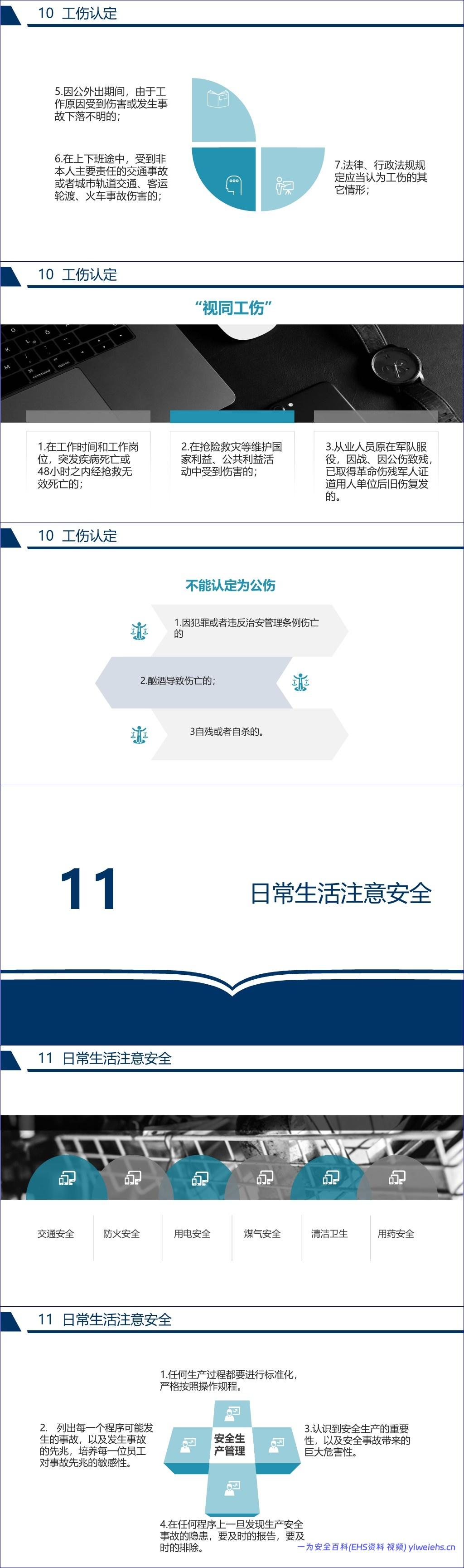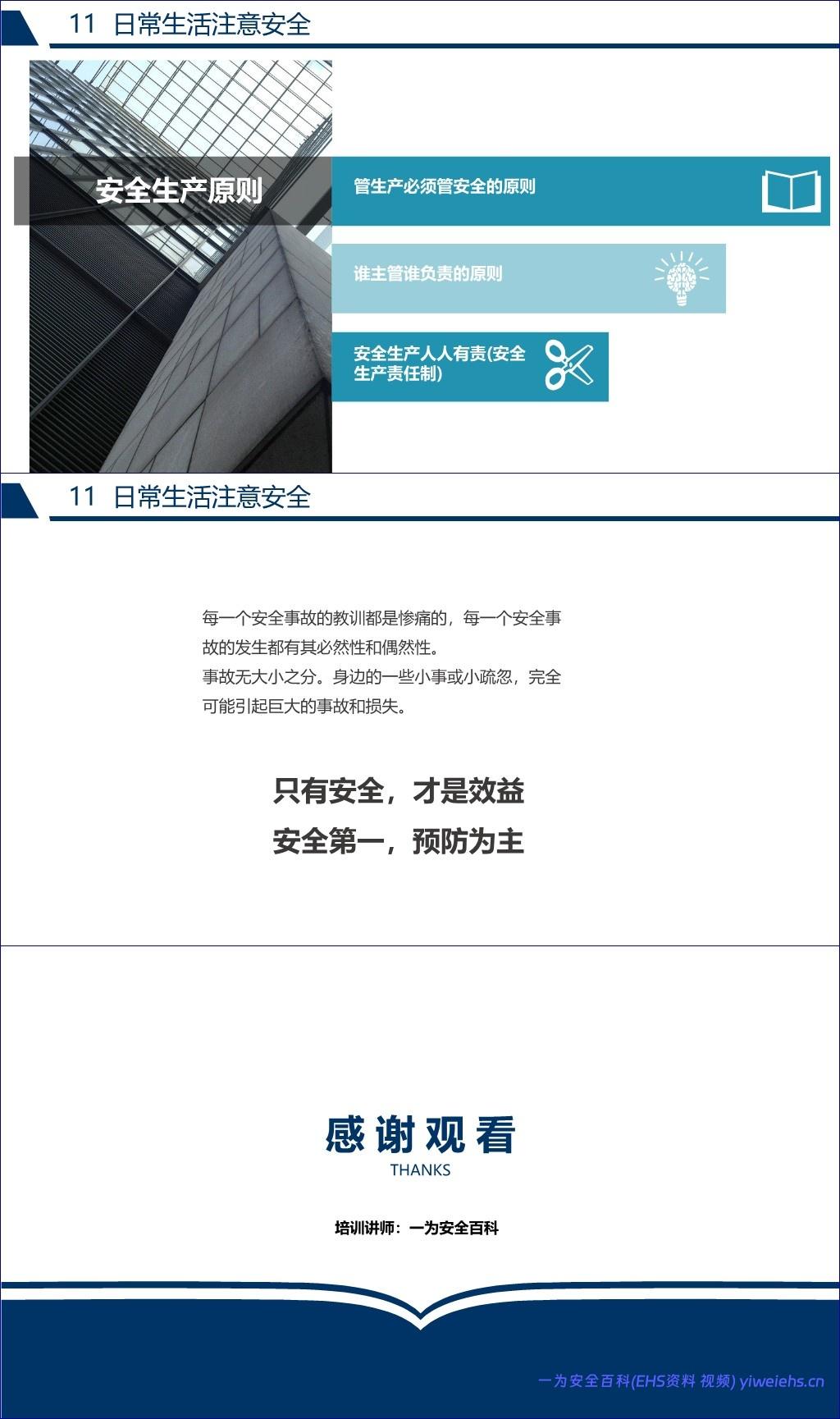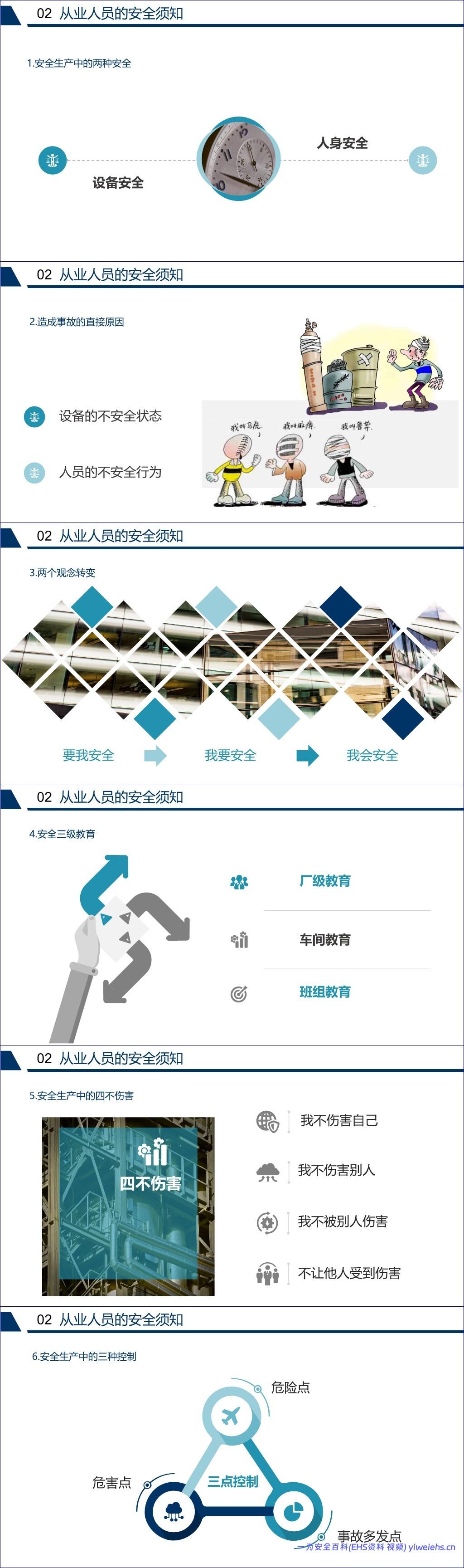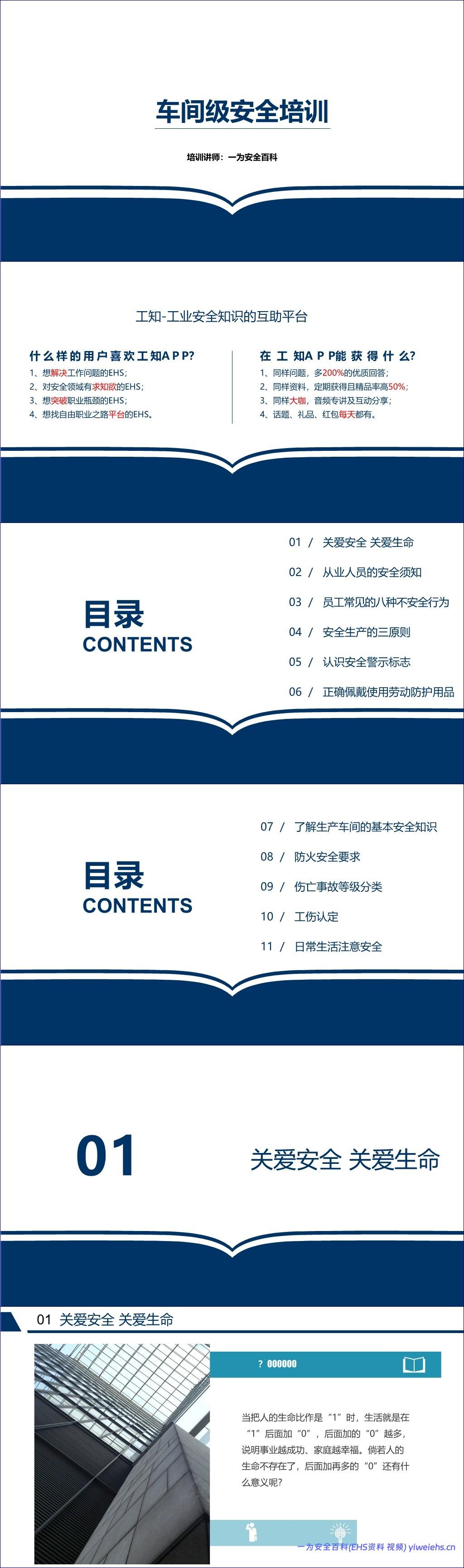 该车间级安全培训文档内容全面详实,围绕“安全生产”核心展开,系统阐述了从业人员须知、不安全行为识别、安全原则、防护措施及事故处理等关键内容。文档首先强调“安全第一,预防为主”的方针,指出事故多由人的不安全行为(占比80%)和物的不安全状态引起,并介绍了海因里希法则以警示隐患苗子的重要性。在从业人员安全须知部分,明确了“四不伤害”、“三违”现象、“三不放过”原则以及员工的十大权利与四项义务,并特别强调了“劳动防护用品”的正确佩戴与使用。文档还列举了员工常见的八种不安全行为,如操作错误、用手代替工具、冒险进入危险场所等,并提出了安全生产的三大原则:整理整顿作业环境、维护保养设备、按标准操作。此外,内容涵盖了安全警示标志的识别、生产车间用电与行走安全、防火安全要求(包括灭火器适用范围)、伤亡事故等级分类以及工伤认定的具体情形。最后,文档将安全意识延伸至日常生活,再次重申了“管生产必须管安全”和“安全生产人人有责”的基本原则,深刻揭示了“只有安全,才是效益”的核心理念。