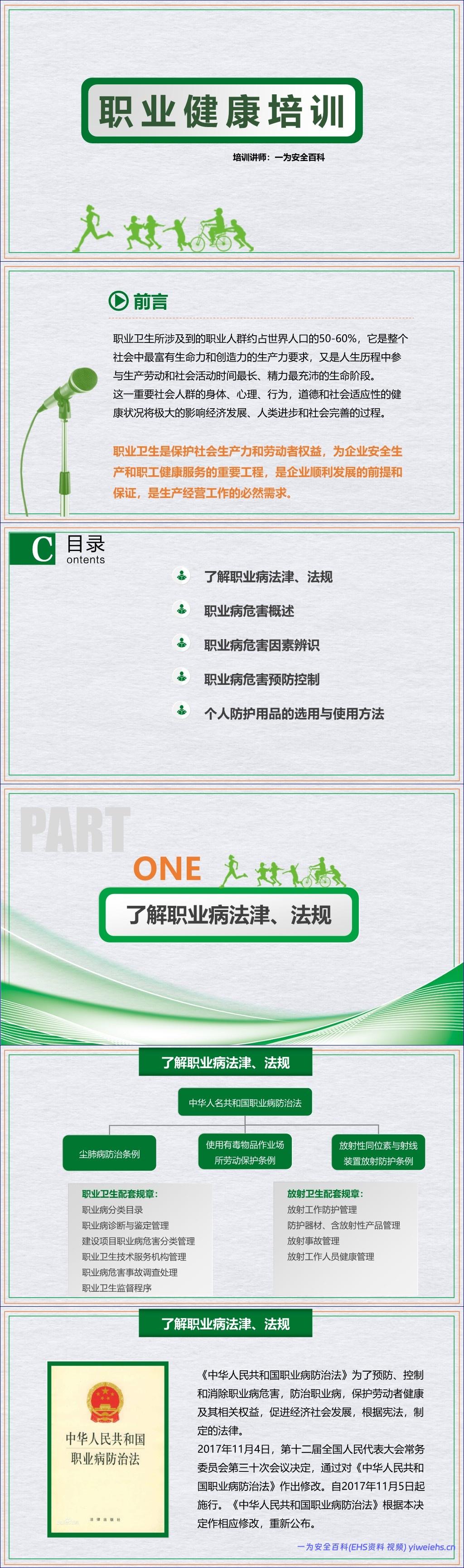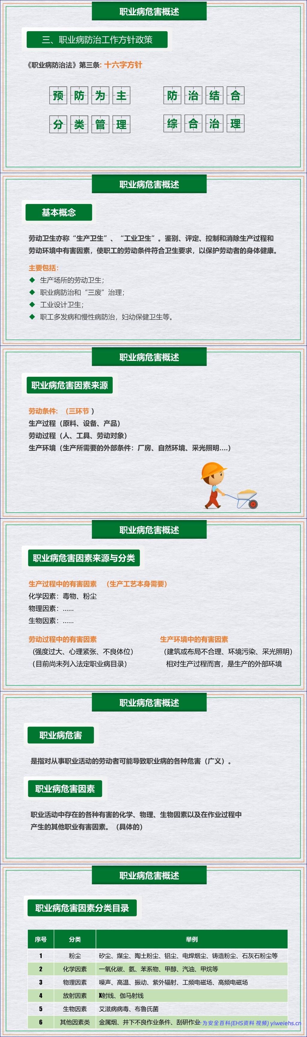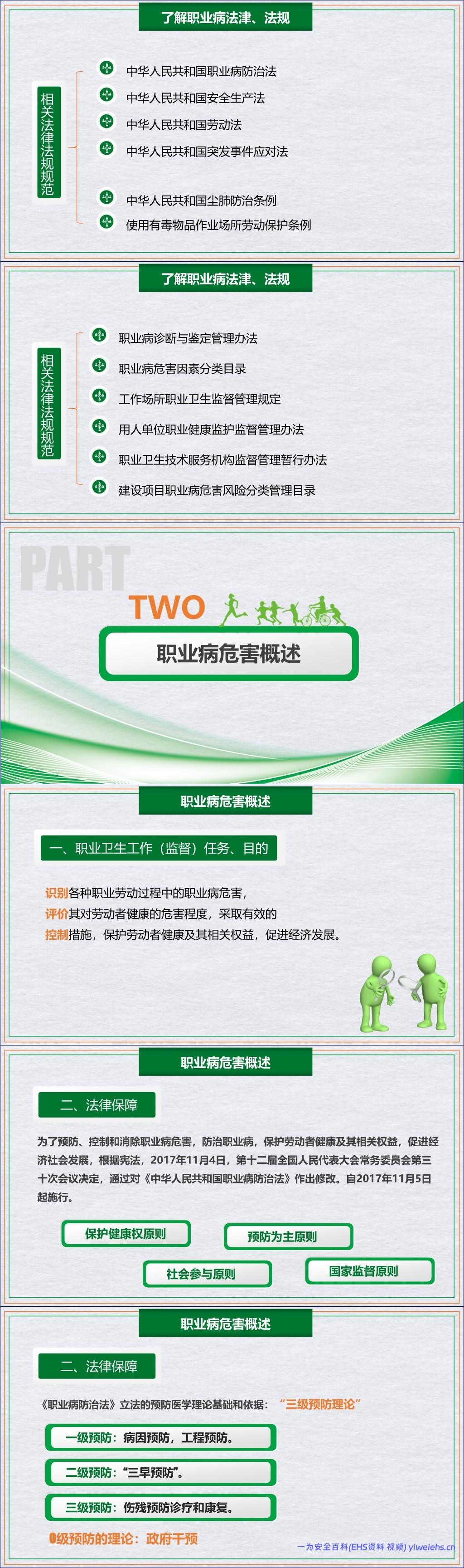 这篇《职业健康专题培训》文档系统全面地阐述了职业健康的核心内容,强调了其对社会生产力、劳动者权益和企业发展的关键作用。文档首先阐明了职业卫生工作的核心任务是识别、评价和控制生产过程中的职业病危害因素,以保护劳动者健康,并促进经济发展。这一目标的实现依托于坚实的法律保障体系,尤其是以《中华人民共和国职业病防治法》为核心的法律法规框架。该法确立了“预防为主、防治结合、分类管理、综合治理”的十六字方针,并基于“三级预防理论”构建了从病因预防到伤残康复的完整链条。
