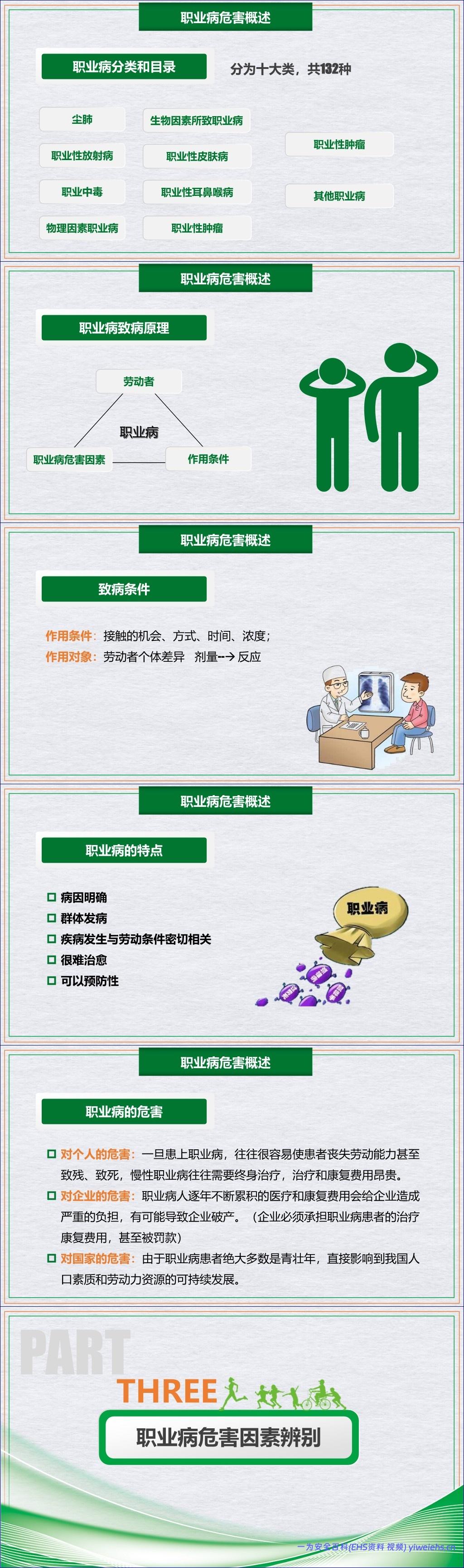 文档详细介绍了职业病危害因素的来源与分类,指出其主要产生于生产过程(如化学毒物、粉尘、噪声)、劳动过程(如高强度、不良体位)和生产环境(如布局不合理)。这些因素被具体划分为粉尘、化学、物理、放射、生物及其他六大类,并可能导致尘肺、职业中毒、物理因素职业病等十大类共132种法定职业病。职业病具有病因明确、群体发病、与劳动条件密切相关、难治愈但可预防等特点,不仅对个人造成致残、致死等严重后果,也给企业和国家带来沉重的经济与社会负担。