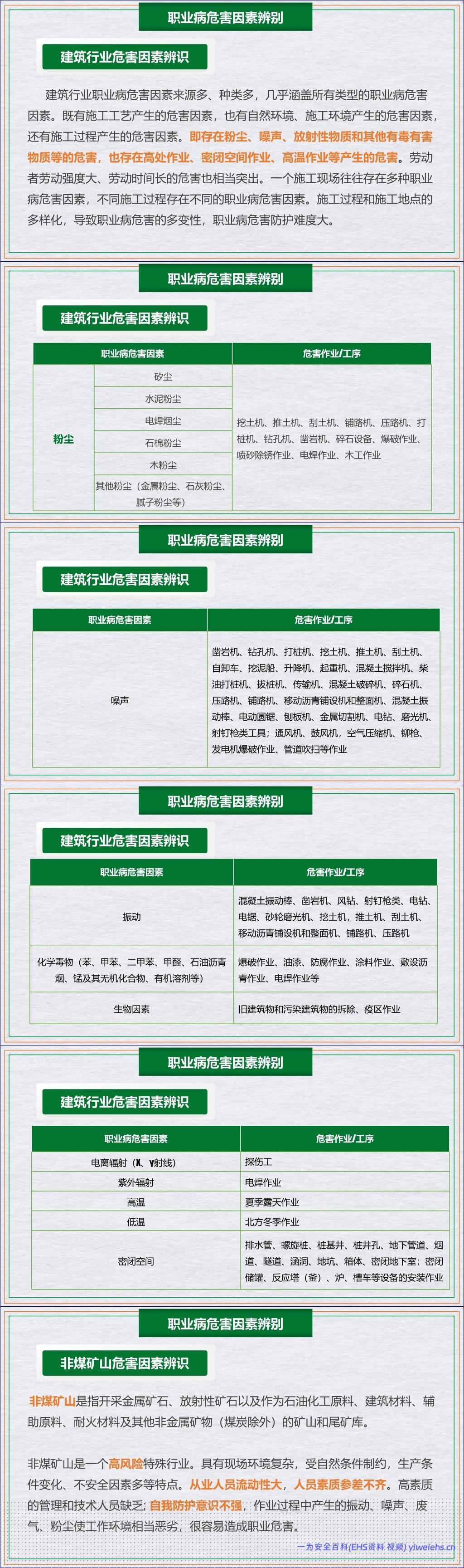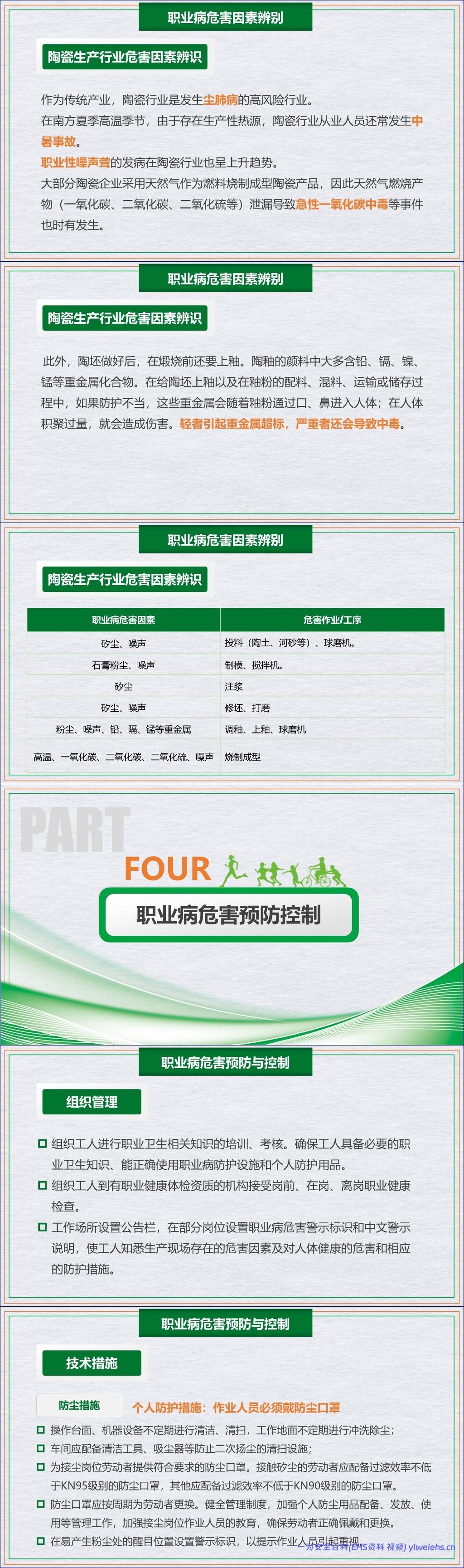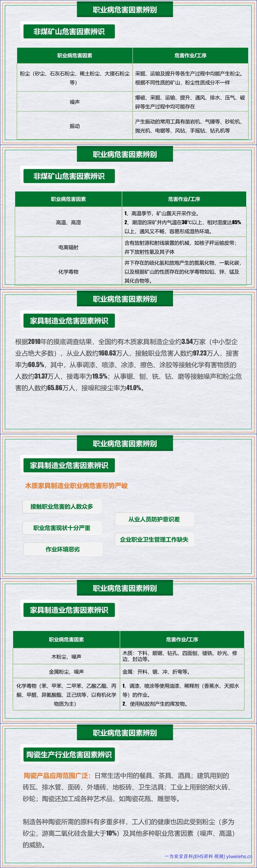 为有效应对这些风险,文档通过建筑、非煤矿山、家具制造、陶瓷生产等多个行业的实例,深入剖析了各行业特有的危害因素及其作业工序,凸显了危害辨识的重要性。在此基础上,文档提出了系统的预防控制策略,包括组织管理(如培训、体检、设置警示标识)和技术措施。技术措施涵盖了针对粉尘、噪声、高温、化学毒物及电焊弧光等的具体防护方法,例如采用低噪设备、加强通风、提供防暑降温用品等。