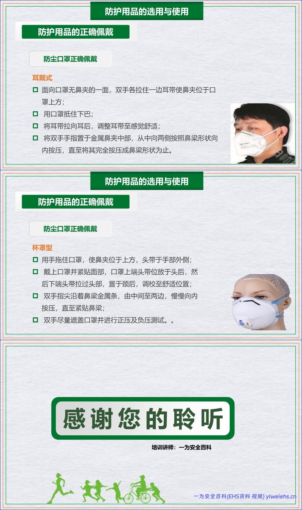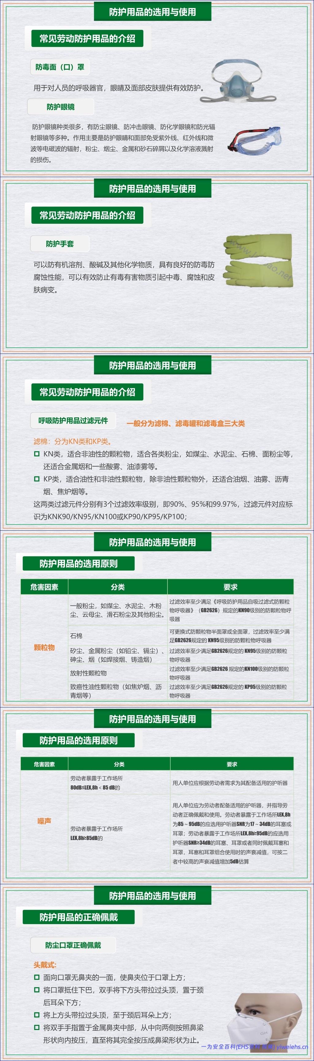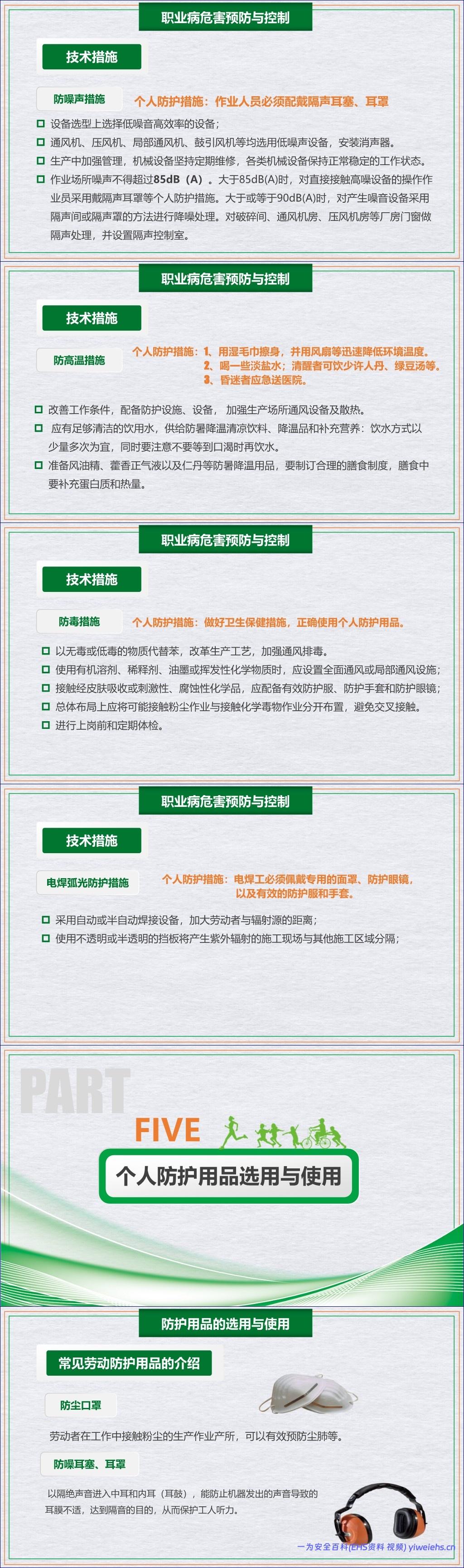 最后,文档重点强调了个人防护用品在职业健康防护体系中的最后一道防线作用。它详细介绍了防尘口罩、防噪耳塞/耳罩、防毒面罩、防护眼镜和手套等常见防护用品的选用原则与正确佩戴方法,并依据国家标准(如GB2626)明确了不同危害因素(如矽尘、石棉、高噪声)下应选用的防护级别,确保防护的有效性。