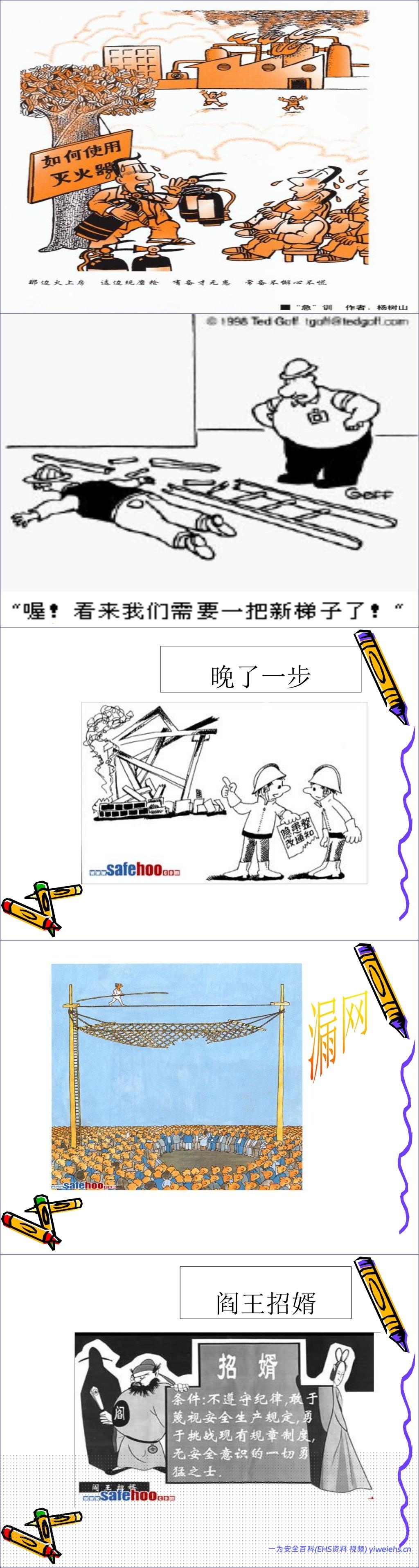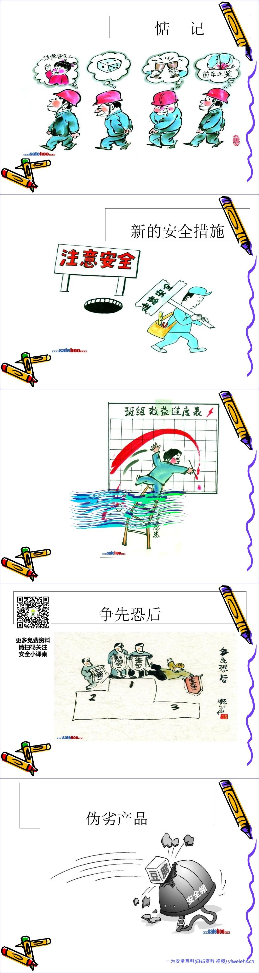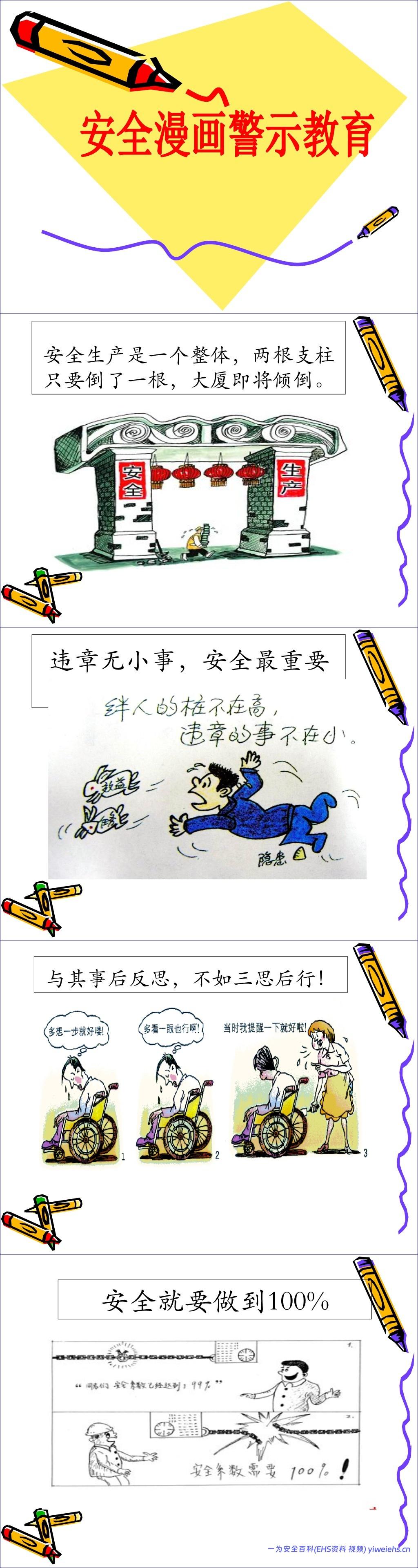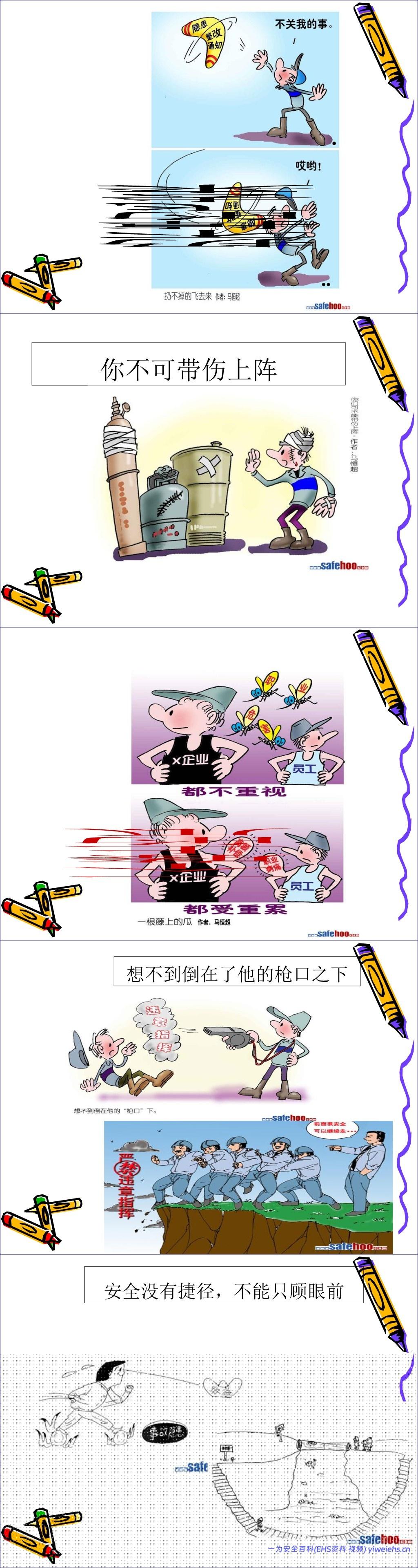 该文档《100张安全漫画警示教育》通过一系列生动形象的漫画形式,深入浅出地传达了安全生产的重要性和必要性。内容强调“安全生产重于泰山”,指出安全生产是一个整体,需要全员参与和重视,任何违章行为都可能带来严重后果,正如“违章就是与狼共舞”。文档特别关注工作场所的安全规范,例如女工进车间必须穿戴合适的工装、平跟鞋,并将长发置于帽内,以避免安全隐患。此外,文档反复强调“安全意识”的重要性,提倡“三思后行”而非“事后反思”,并提出“三不伤害”原则(即不伤害自己、不伤害他人、不被他人伤害)作为安全工作的基本准则。安全教育需常态化、日常化,不能流于形式或仅在事故发生后才重视,因为“安全重在平时,等事故发生后就‘晚了’”。文档还通过“四个零”、“三道安全防线”等概念,倡导建立全面的安全管理体系,杜绝侥幸心理,做到“安全就要做到100%”。