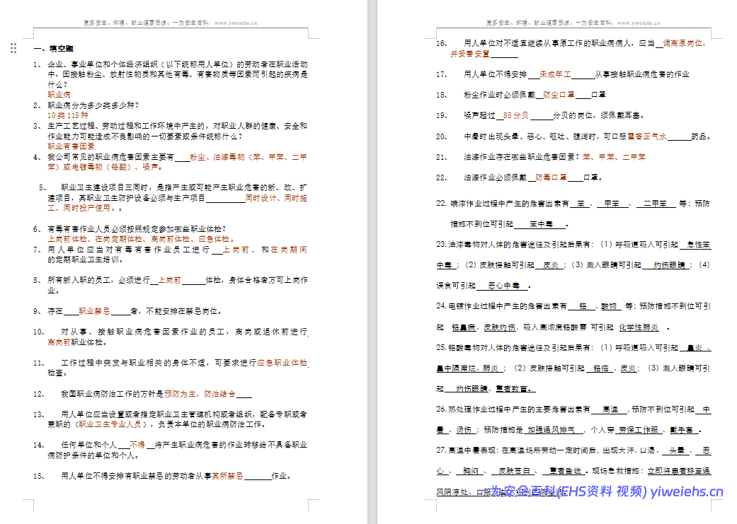 问答题部分则要求对特定岗位(如喷漆工、电镀工、热处理工)的综合防护策略进行系统性回答,涵盖了工程控制(如保证抽风除毒设备有效运行)、个体防护、健康监护和健康生活方式等多个层面。同时,还解释了职业病“三级预防”体系(病因预防、发病预防、康复预防)和尘肺病的成因及预防方法。