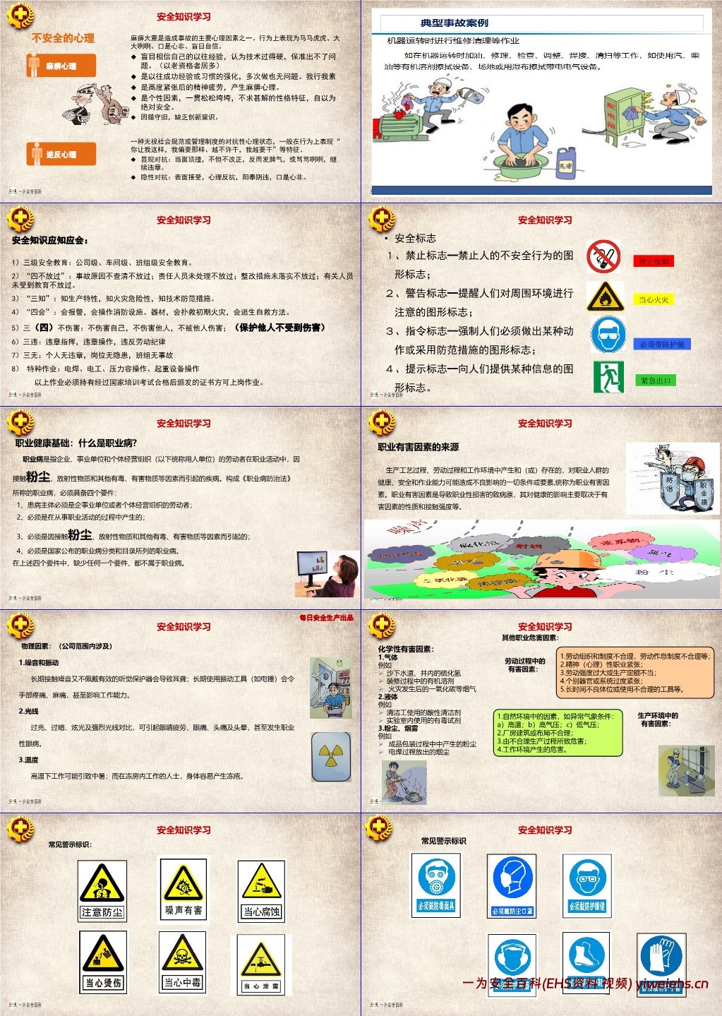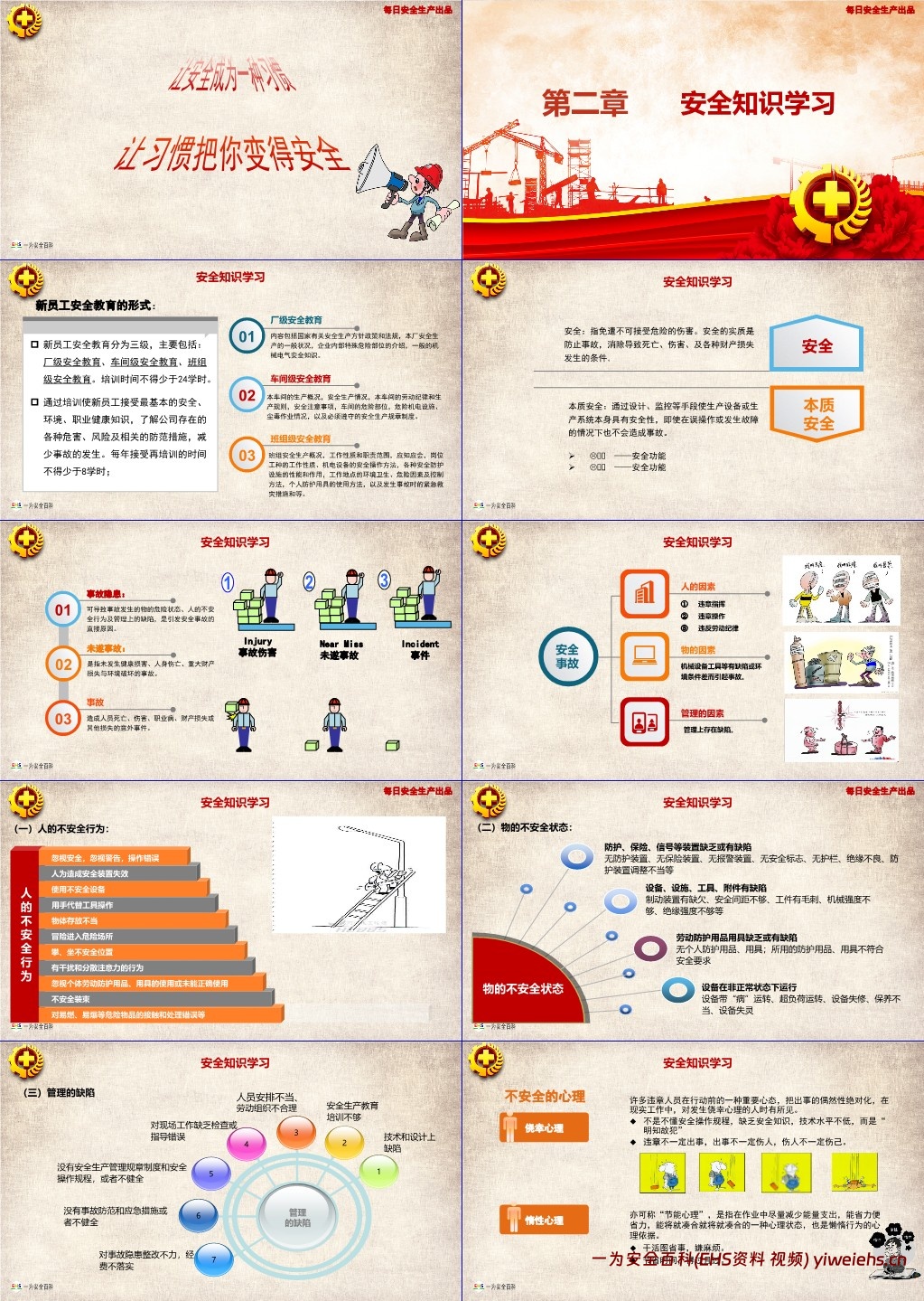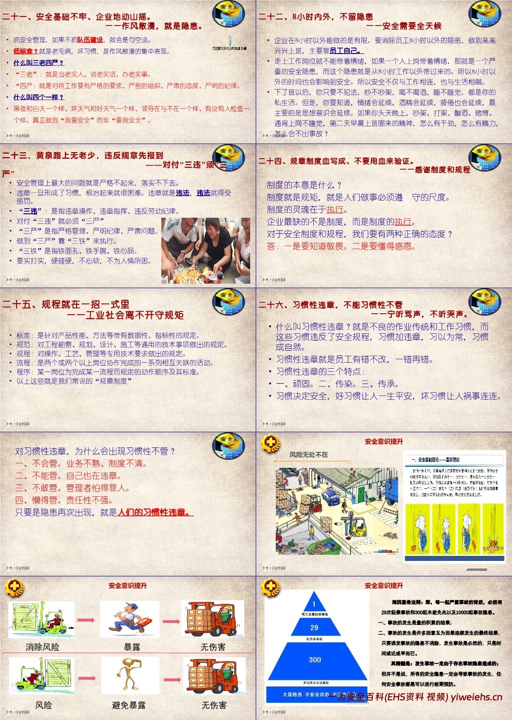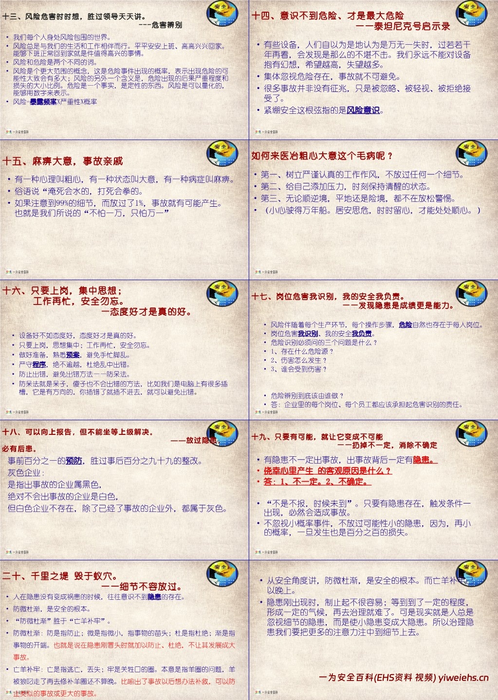 指出风险与危险的区别,风险可量化(风险 = 暴露频率 × 严重性 × 概率),意识不到危险是最大危险,需警惕麻痹大意、侥幸心理等不安全心理,注重细节防范,避免小隐患酿成大事故。