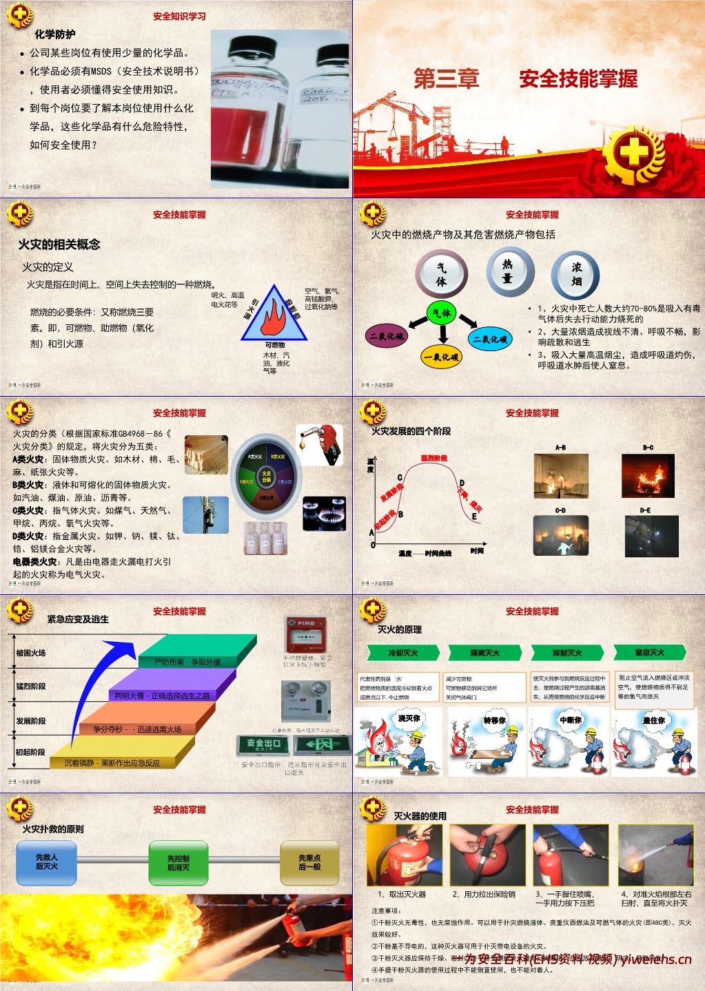 灭火原理:冷却灭火(如水降温至燃点以下)、隔离灭火(转移可燃物、关气体阀门)、窒息灭火(阻止空气流入)、抑制灭火(灭火剂中断燃烧反应)。