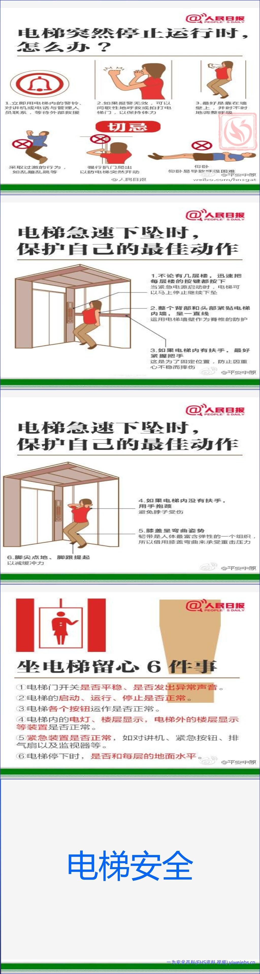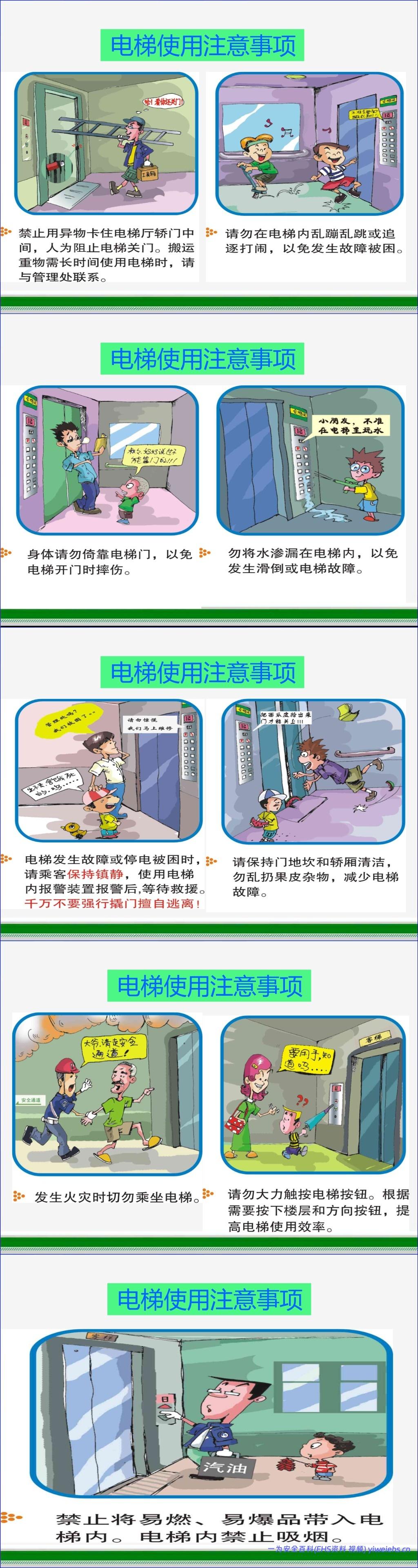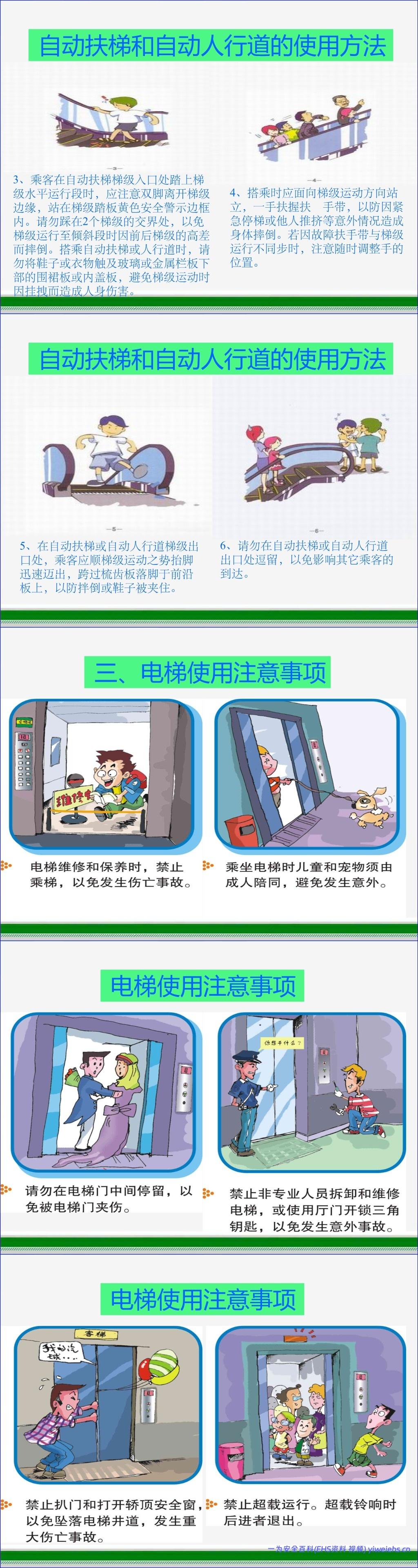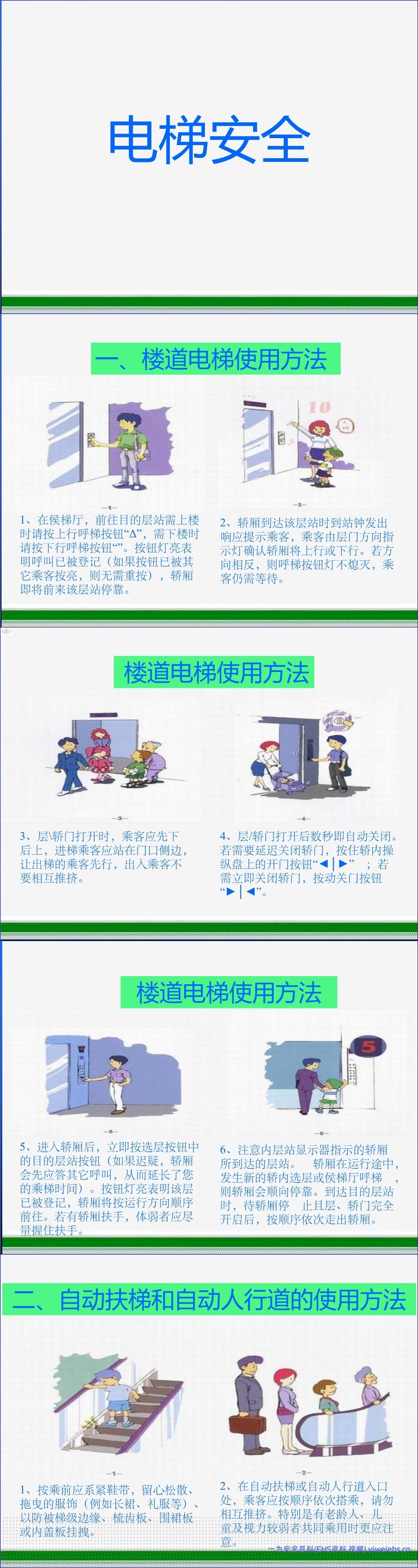 该文档《电梯安全》详细介绍了楼道电梯、自动扶梯和自动人行道的正确使用方法以及相关的安全注意事项。在楼道电梯使用方面,文档指导用户如何正确呼梯(按上行“Δ”或下行按钮)、进出轿厢(先下后上,不推挤)、操作开关门按钮(“◄│►”开门,“►│◄”关门)以及在轿厢内选择目的楼层并注意扶手使用。对于自动扶梯和自动人行道,强调了乘梯前的准备(系紧鞋带、注意服饰),搭乘时的规范(面向运行方向、握住扶手带、双脚置于黄色安全线内、避免踩在梯级交界处),以及在出入口的安全行为(迅速迈出、不在出口逗留)。此外,文档还包含大量关于电梯使用的通用安全提示,旨在提升公众的电梯安全意识,预防事故发生。