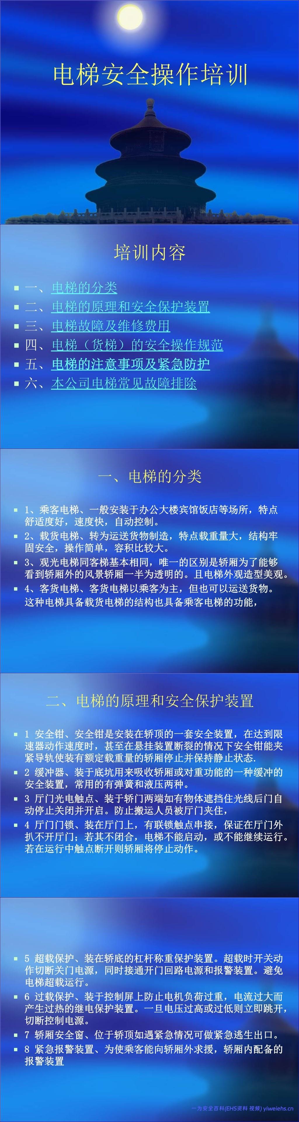 该文档是一份关于电梯安全操作的培训材料,内容全面详细,涵盖了电梯的分类、工作原理与安全保护装置、常见故障原因、安全操作规范、使用注意事项及紧急情况应对措施,并针对公司内部电梯的常见故障提供了具体的排除方法。
