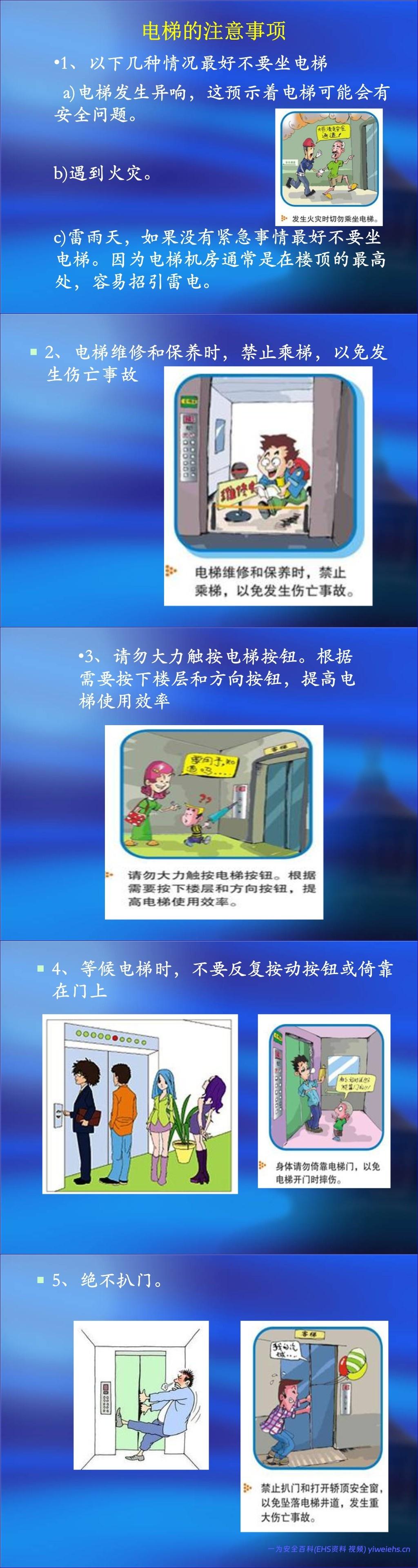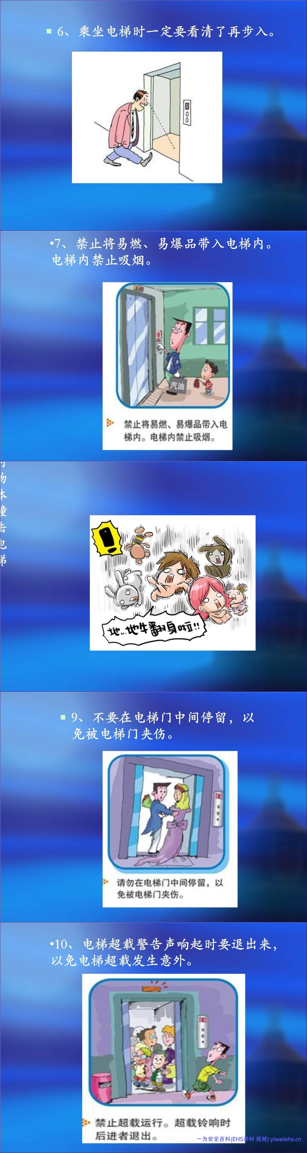 此外,文档还列出了详尽的电梯注意事项及紧急防护措施。例如,使用前需确认轿厢状态;运行中若突停,应保持冷静并通过报警装置求救,切勿扒门或乱动按钮;若电梯失控下坠,应采取下蹲抱头姿势。同时,文档提醒在电梯异响、火灾、雷雨天等情况下避免使用电梯,并列举了14条具体的行为禁令,如禁止吸烟、禁止倚靠电梯门、禁止在门中间停留等。
