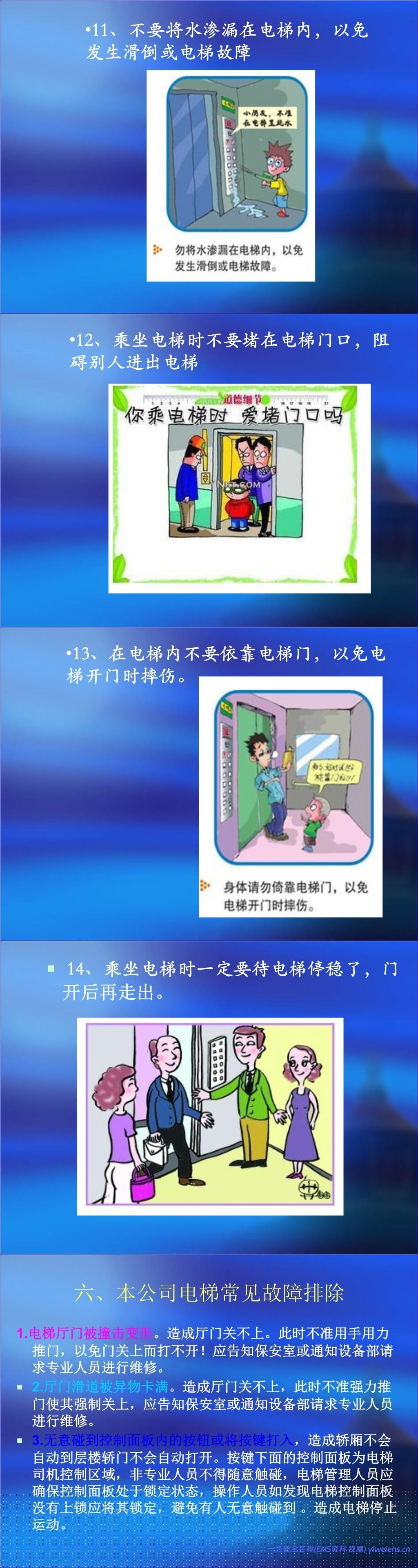 最后,针对本公司电梯常见故障,如厅门变形、滑道卡异物、误触控制面板等,文档提供了明确的处理流程:禁止强行操作,应立即联系保安室或设备部,由专业人员进行维修。
